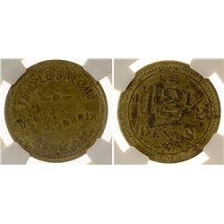 Ultra-rare Bodie token, c.1890. Temple Saloon / Delury & Garcia / Bodie, Cal. // 12 1/2 / Cents. NGC, XF 40. Brass, 25mm. Probably the finest kn...