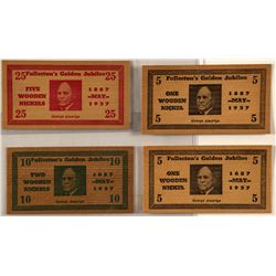 Five tokens: 3 tokens for the 125th anniversary of Fort Benton / 1846-1971 / Birthplace of Montana. 40mm each. One Fort Benton / 1860 // Baker Street