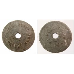 Lot includes: 2 R-6 tokens: 1) Johnson & Burke / The Turf / Saloon / Montana // GF / One / Drink / Or Cigar. Round, white metal, 21mm, punch out...