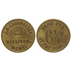 J. P. Oberweiser / Billings / Mont. // GF 6-1/4c / At The Burf Jug. Round, brass, 20mm. State: Montana City: Billings Date: FHWAC#: