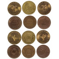 12 Medals from Frontier Town. J. R. Quigley Territory. Copper and aluminum varieties. Great embossing of miner panning gold. Three GF tokens, 5c, 10c,