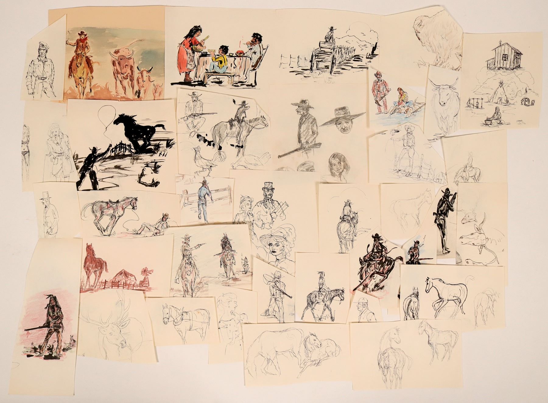 This is a collection of sketches from artist Gib. Hughes. All are sketches on artist paper; all are ink, some are color filled in pencil. Some are of hombres, pretty girls, ugly cows, gunslingers, and handsome horses. Only one sketch is signed but all are from the same hand.