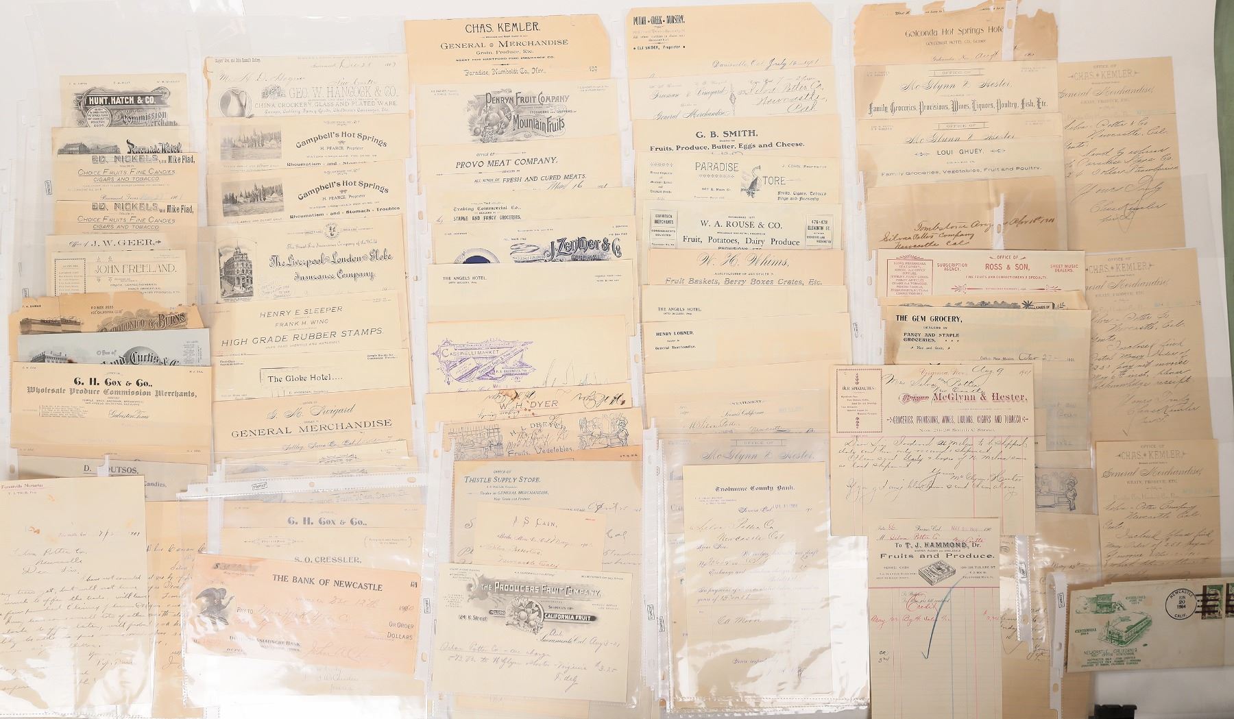 Billheads from all over the western states, including the National Ice Company of San Francisco, T.J Hammond Fruits & Produce of Fresno, Charles Kemler General Merchandise of Humboldt, Nevada, The Bank of Newcastle (California), Putah Creek Nursery of Davisville (Davis), California. A ton more. Please see photos for more details. California