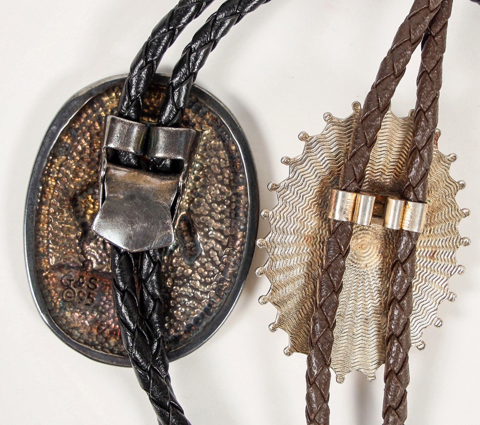 Lot of two: 1) possibly peridot stones in a gold toned oval mount (35 x 45 mm), brown leather. 2) End Of The Trail with black background, oval (38 x 50 mm), black leather.
