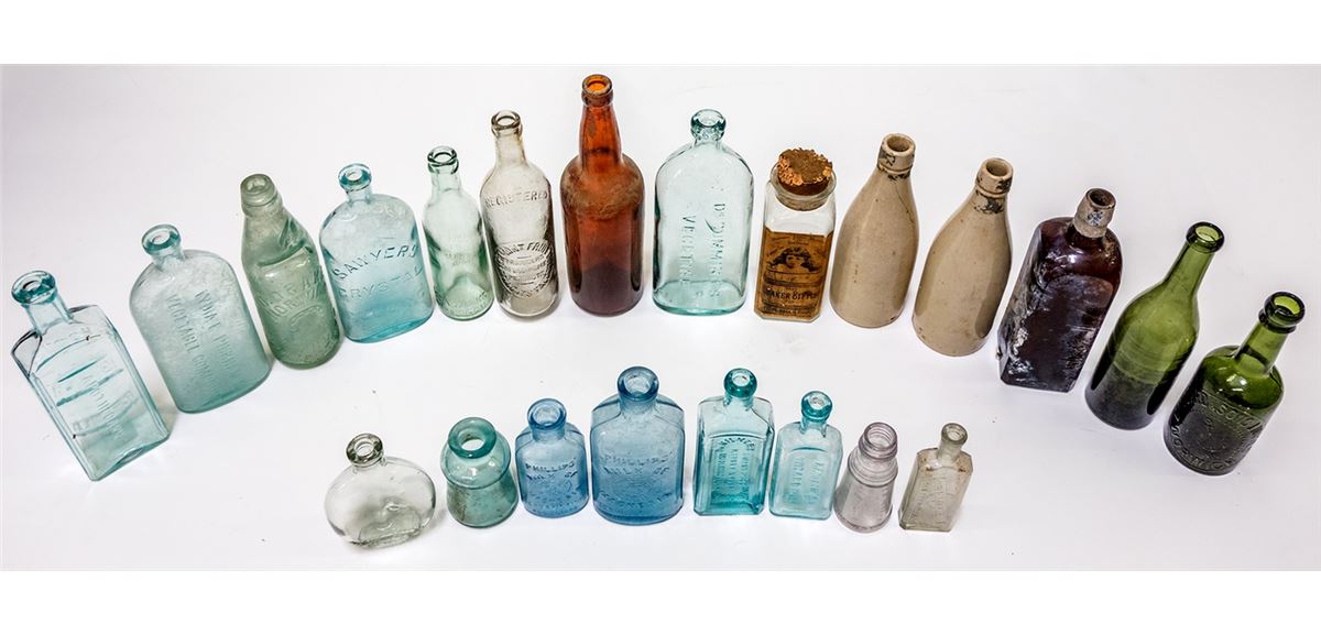 More than twenty antique bottles covering a variety of contents: whiskey, beer, soda, medicine, bitters. Includes light cobalt medicines, a few patent medicines for the snake oil salesmen, etc. One of the best pieces is one of the early Hostetters Bitters, in dark amber with McKee on the bottom. Most of these come to us from the Mother Lode region. Classic mining camp bottles.