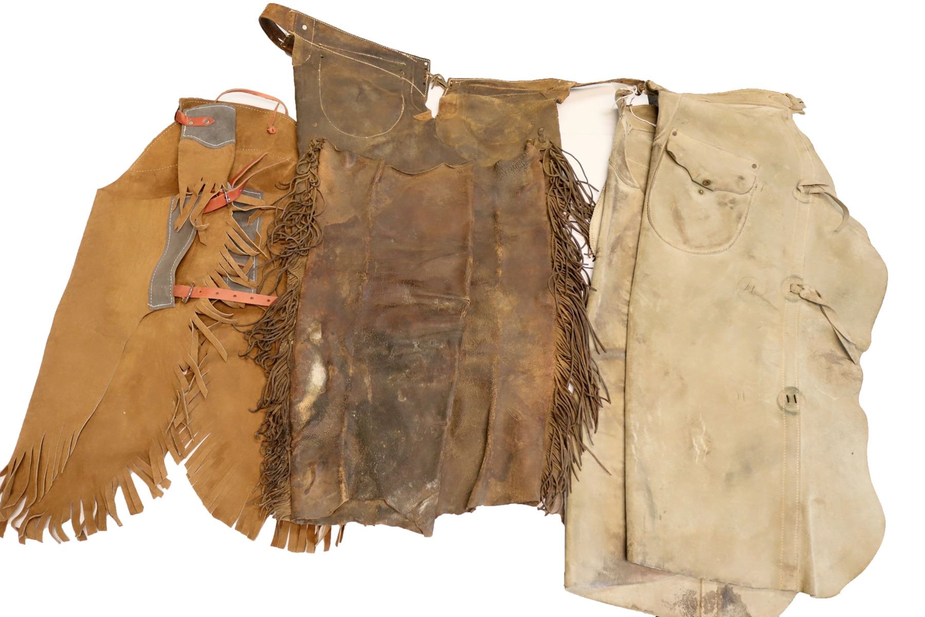 Three pairs, one for child. Well worn. Gray suede and two brown suede with fringe. Tagged by retail seller "FA Menga Old Shotguns with spaghetti fringe"