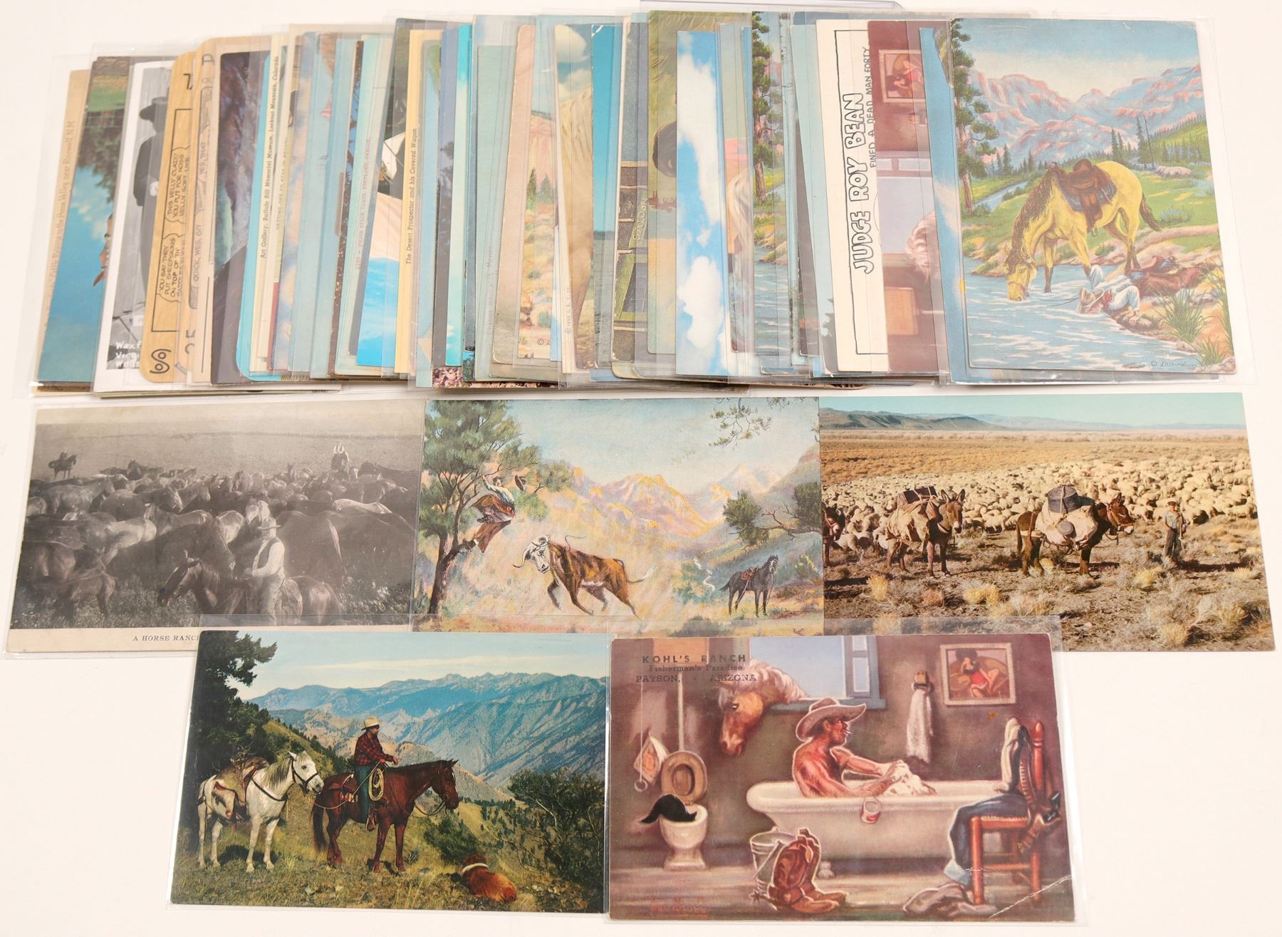 71 Western Cowboy & Cattle Drive postcards with 8 black and white, 50 color, 4 comic and 9 duplicate postcards. Cards include Art Miller on Peavines Golden Major, Basque shepherds tending to Nevada's sheep, picture of original oil painting by artist and poet L. H. "Dude" Larsen and a western deer hunter.