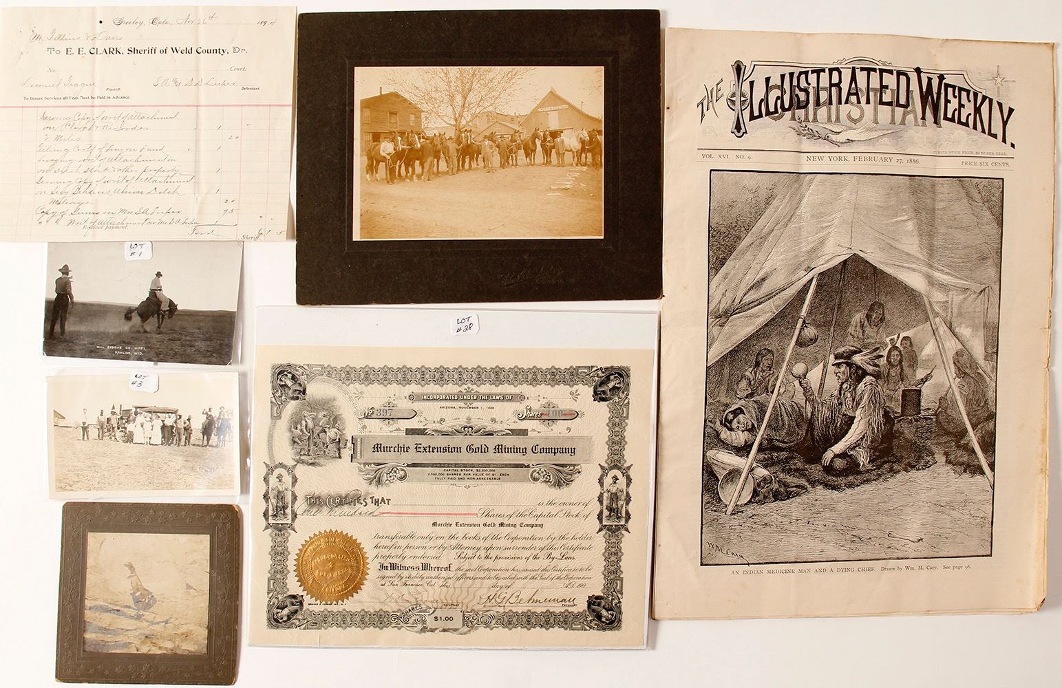 Montana CDV of ranching family and cowboys, Greeley, CO Sheriff list of fees for services 1894, 1906 Murchie Extension Gold Mining Certificate u/i, cabinet card of a man in high boots wearing a holstered revolver c. 1900's, RPC of Will Robbins cowboy in woolies, large cabinet card of horses, men in Lamoni, IA c. 1890's. Original Christian Illustrated Weekly Feb. 7, 1886. Date: Location: HWAC# 57907