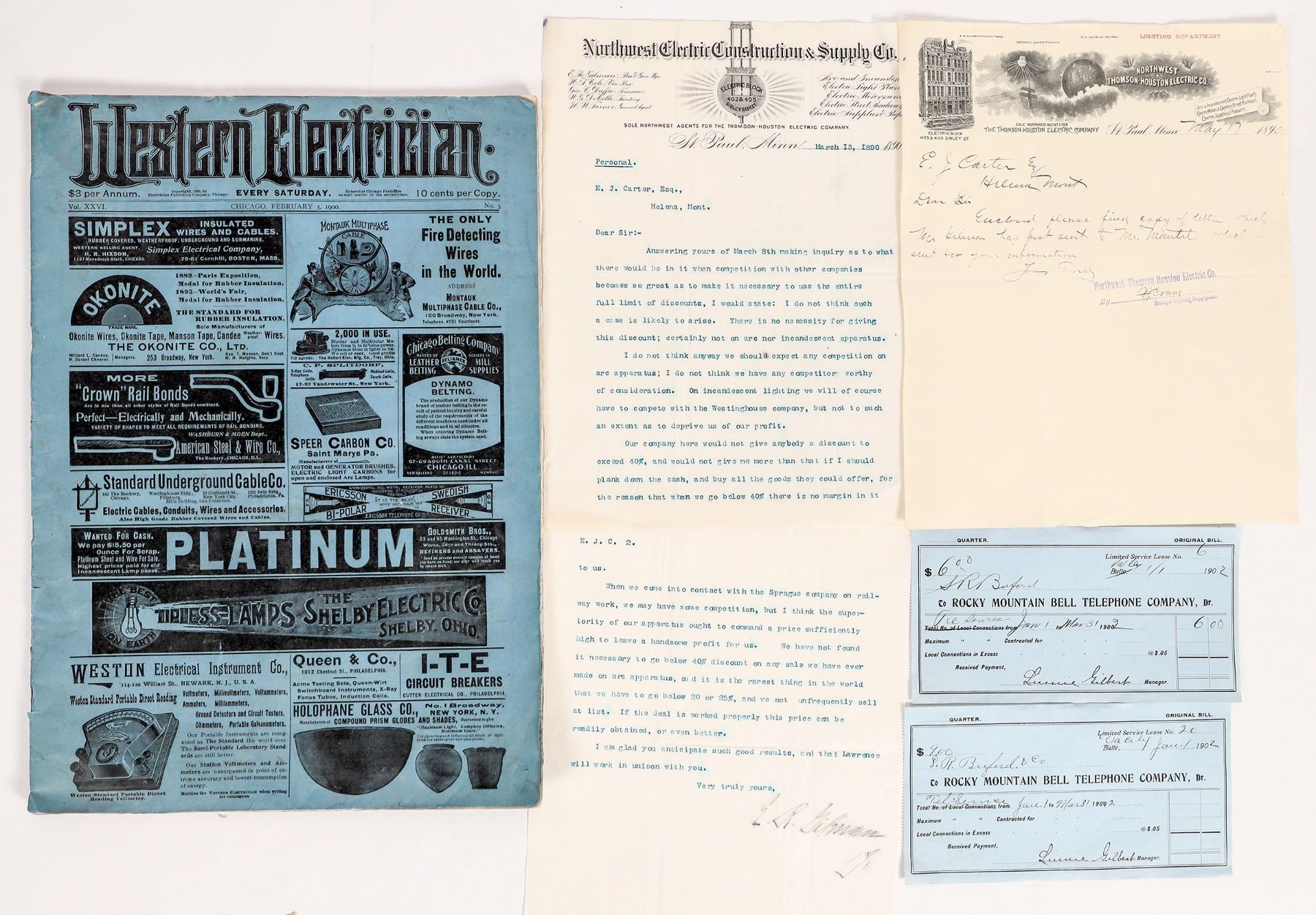 1900 Western Electrician magazine with advertisement of the era's gear, articles such as development of the telephone, etc. Some spine separation. 2x 1890 electric letterheads, 2x 1902 Rocky Mountain Bell checks.