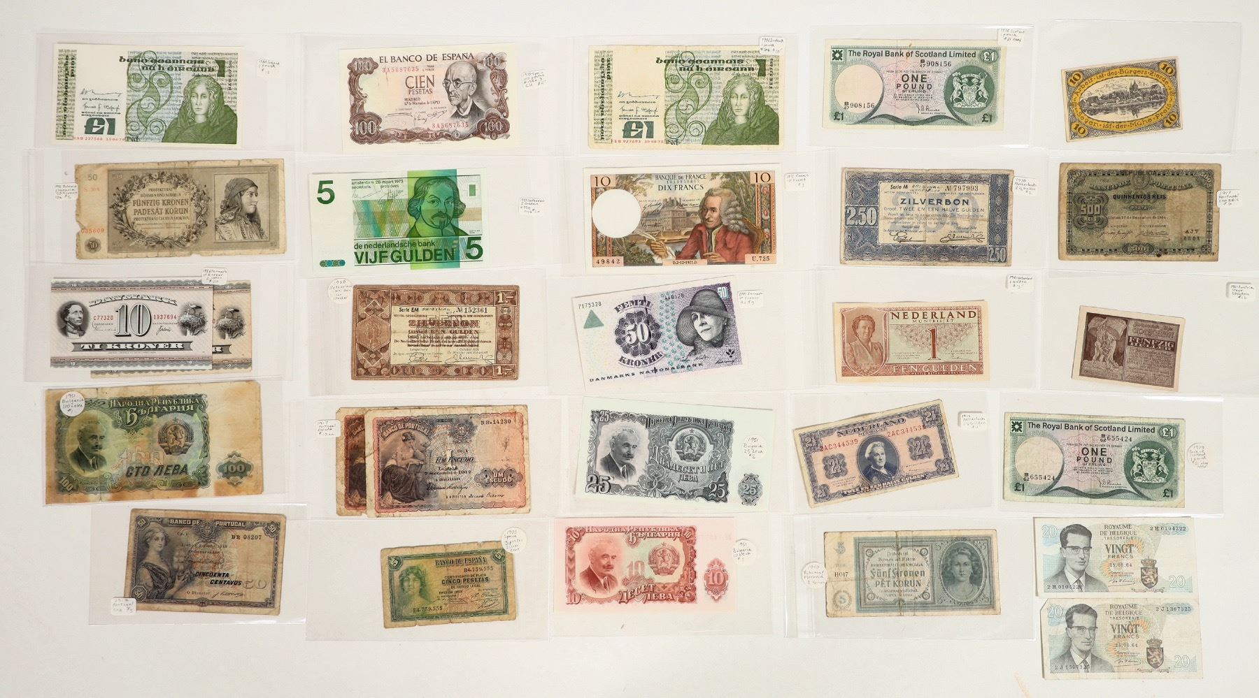 Currency notes from Europe: Netherlands (5); Portugal (4); Bulgaria (3); Bohemia (2); Denmark (2); Ireland (2); Spain (2); Belgium (2); Scotland (2); Austria; Denmark; France; Poland.