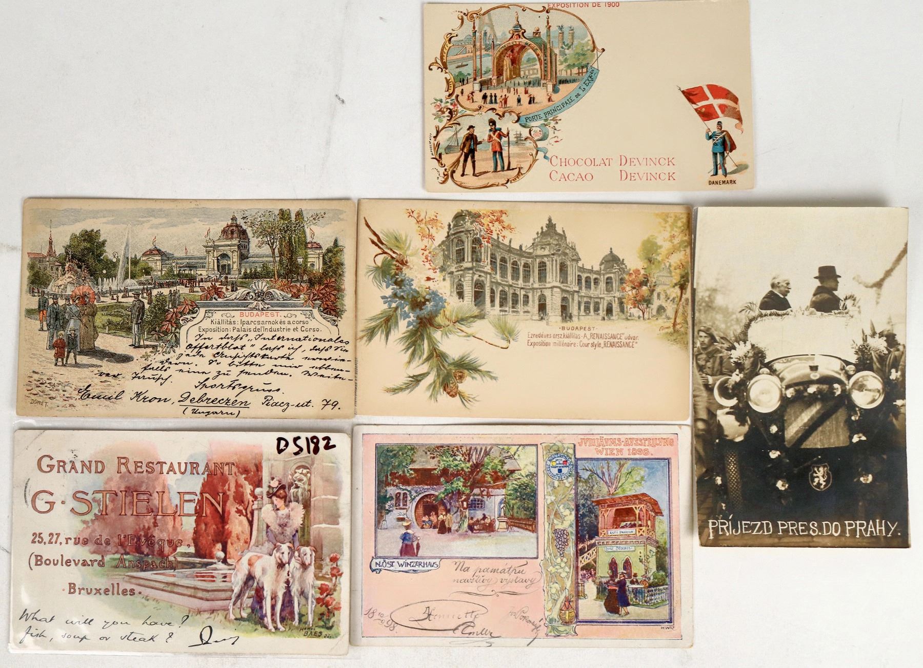 6 early Western Europe postcards. 1 RPC-Prijezd Pres. Do Prahy. Danemark, 1898 Wien, 1901 Bruxelles, 1896 Budapest, 1899 Budapest.[ Europe