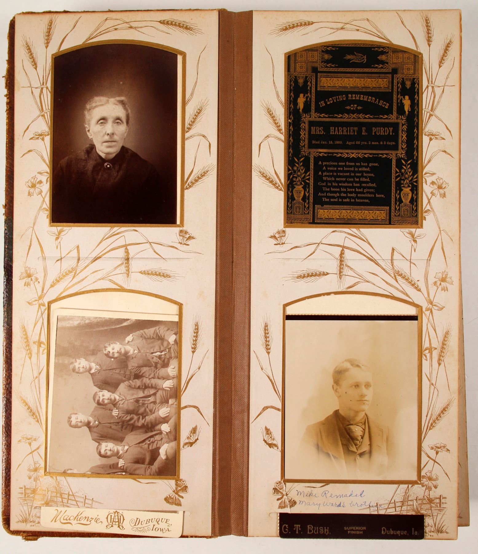 Family photo album. Large format cabinet card photo album circa 1880 to 90, approximately 16“ x 8“. Holds four cabinet cards per page. The album is approximately 2/3 full. Many of the photographs label who the people are. Family surnames include Remakel, Ward etc. The photographs were generally taken in Iowa and Wisconsin. We hope a family member finds this in our sale as it would be a real treasure trove. City: State: Iowa Date: 1880