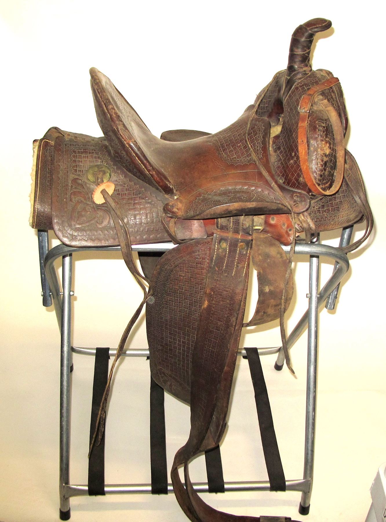 Circa 1920's, unmarked high back 14" saddle. 3/4 single rig, possibly of Montana origin. damaged, please inspect. Fancy basket weave pattern with star and shield motifs on flanges. Date: City: State: HWAC# 56448