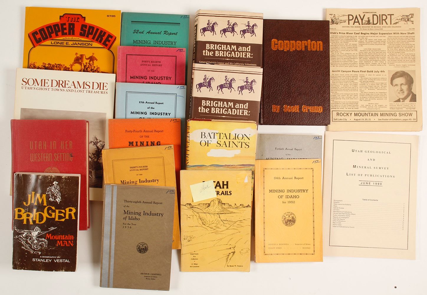 Approximately 15 books on Western history mostly from Idaho, Utah, and Alaska. Includes Brigham the Brig., Jim Bridger Mountain man, Copper Tent, Utah in her Western setting, Battalion of Saints, a series of eight annual reports of the mining industry of the state of Idaho which are key references for mining in Idaho. these are generally from the 1930s. Others. Please inspect, this is a nice group. HWAC# 62130 Date: Location: