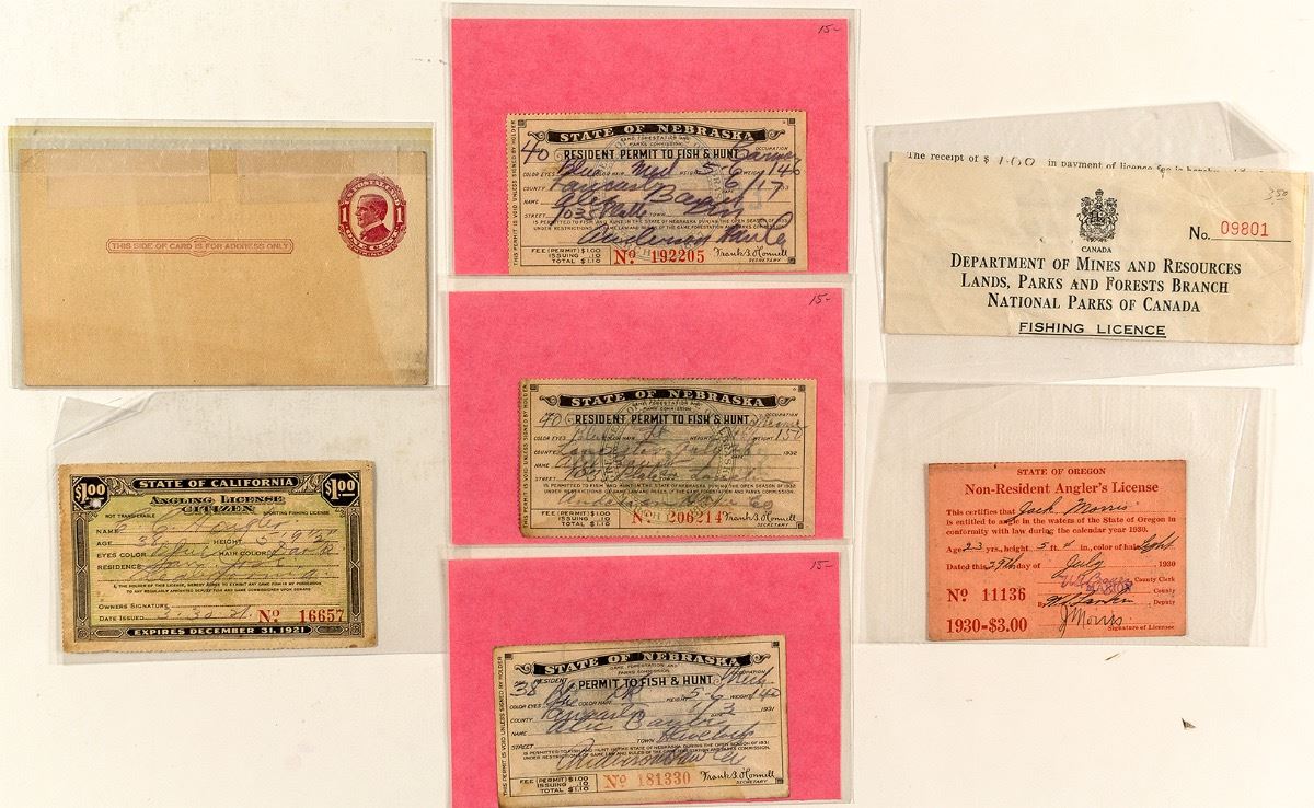 Lot of seven. Includes: 1921 California Angling License (San Jose), 1930 Oregon Angler's License, three Nebraska Hunting & Fishing licenses (1931-33), Canadian fishing license, and a c.1910 cover advertising a hide shop in Reno. (Prag Collection) City: State: United States Date: hwac# 34312