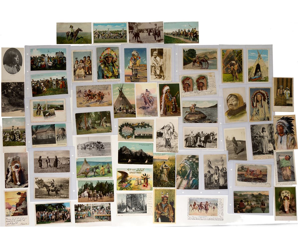 Lot of 57 cards. Various publishers. Some are RPC. Native American figures such as: Chief Wau-Ko-Ma, Chief Gotebo, Chief Standing Deer, Princess Angeline, Abbie Gardner Sharp, Geronimo, White Bull, Red Cloud, and Lone Wolf. Some used. Many are very colorful. Many different tribes and activities represented: Bannock, Ohinemutu, Minnehaha, Flathead, Apache, Pomo, Sarcee, Comanche, Cherokee,Sioux, Blackfoot, Piute, Kiowa, war dance, medicine men, washing clothes, Indian school, etc. Please inspect this fantastic collection!