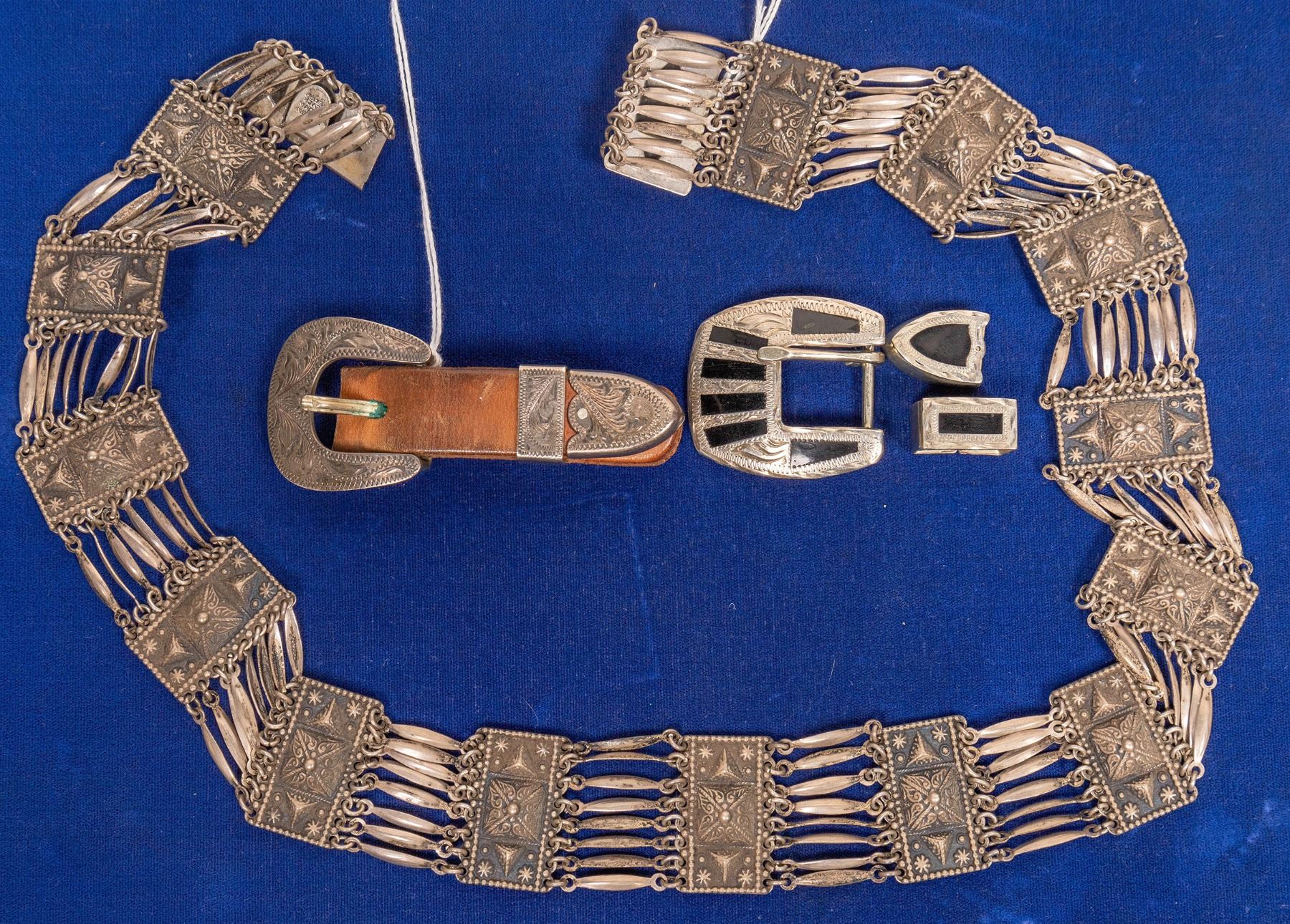 1) Women's vintage silver concho belt. 29" long, conchos 1.25" width. Rectangular conchos with embossed detailing hooked together with 8 slim pieces of silver in rows--please see photo. 190g. 2) Fine vintage sterling silver Ranger style engraved western belt buckle set. 3) Modern sterling belt buckle set. Engraved silver inlaid with onyx. Beautiful set.