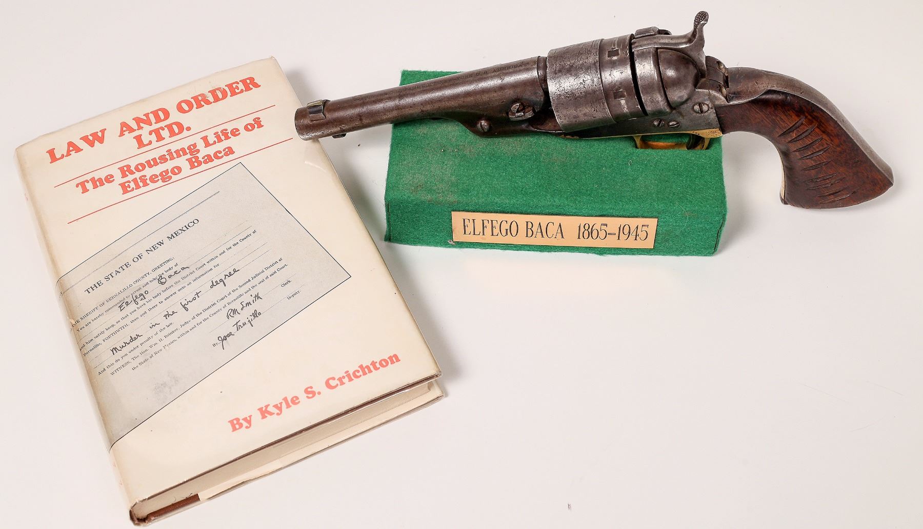 This gun is accompanied by the book: "Law and Order Ltd. The Rousing life of Elfego Baca by Kyle S. Crichton" hardcover with DJ, first edition 1928, numbered #52, autographed by the author and by Elfego Baca, 219 pg.