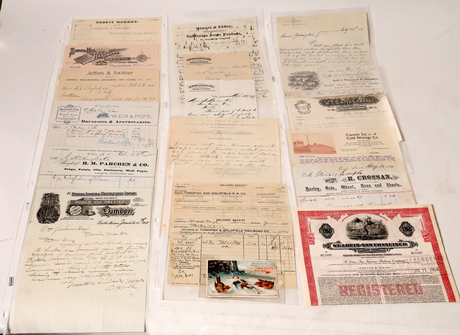 16 western letterheads, c. 1875-1905. Tucson, Elko, NV, Austin, NV, Tonopah, NV, Glenn's Ferry, ID., San Francisco, Butte, MT, Helena, MT, Jeffers, MT, Prescott, AZ etc.
