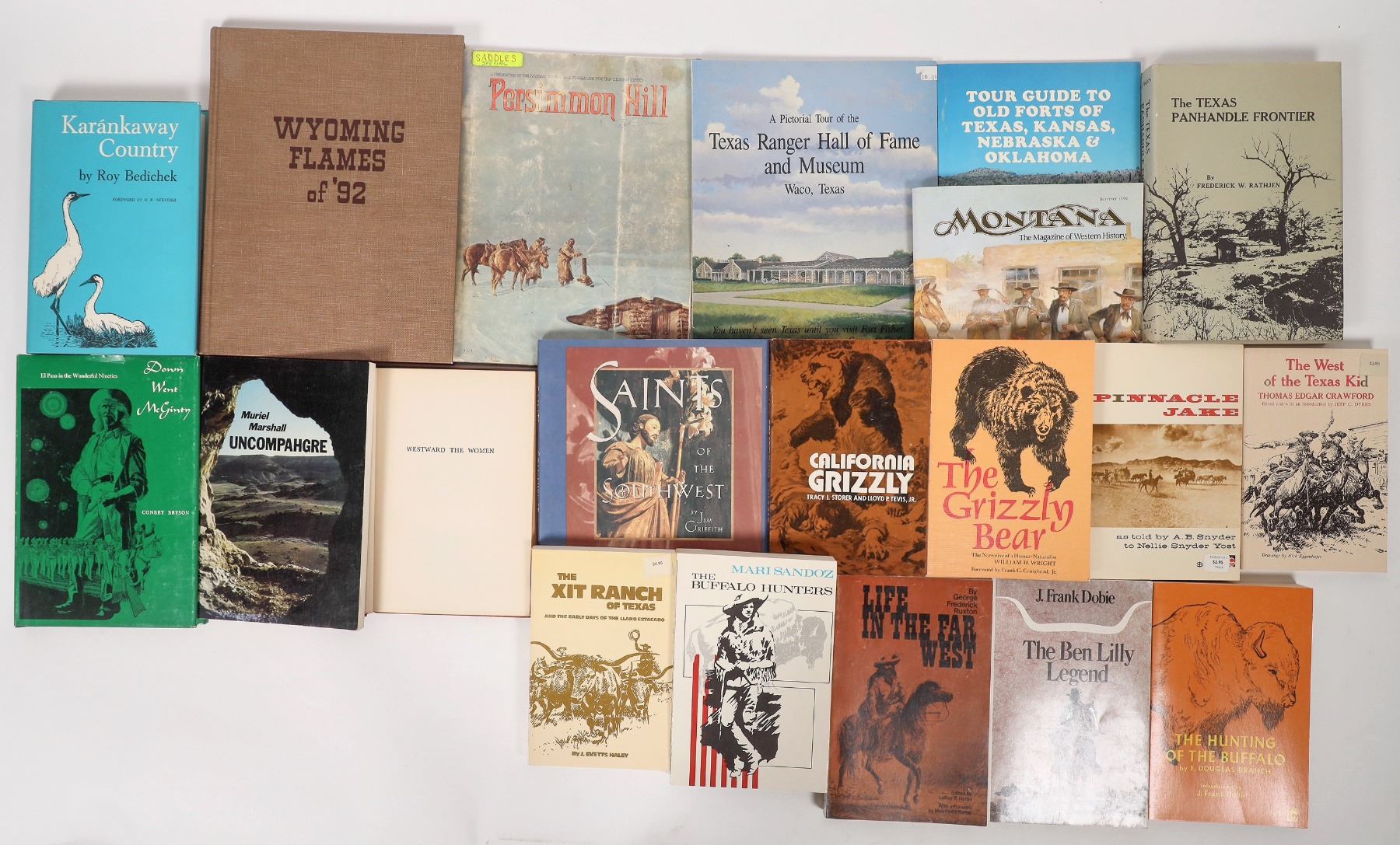 A library of 17 books, plus 3 booklets, pertaining to the Western frontier, all in good to mint condition. Includes: "Wyoming Flames of '92, Official Communications during the Johnson County Cattle War," Hill's Creative Printing, South Dakota, 1972, hardback, 148 pp.; "Saints of the Southwest," Jim Griffith, Rio Nuevo Publishers, 2000, hardback, dust jacket, 62 pp.; "Westward the Women," Nancy Wilson Ross, Alfred A. Knopf, 1944, First Edition, hardback, 199 pp.; "Karankaway Country," Roy Bedichek, University of Texas Press, 1950, hardback, dust jacket, 290 pp.; "The Texas Panhandle Frontier," Frederick W. Rathjen, University of Texas Press, 1975, hardback, dust jacket, 286 pp.; "The Grizzly Bear, the Narrative of a Hunter-Naturalist William H. Wright," University of Nebraska Press, 1977, paperback, 274 pp. See photo(s) for more books in this lot.