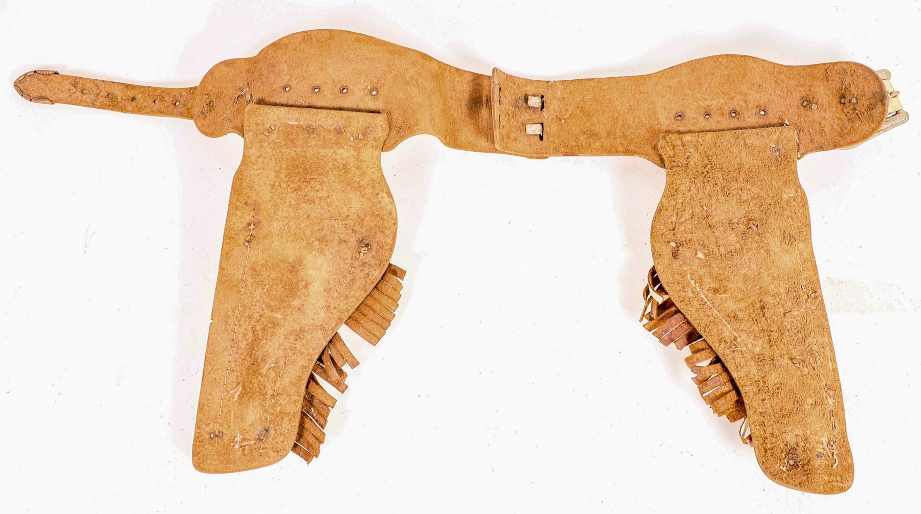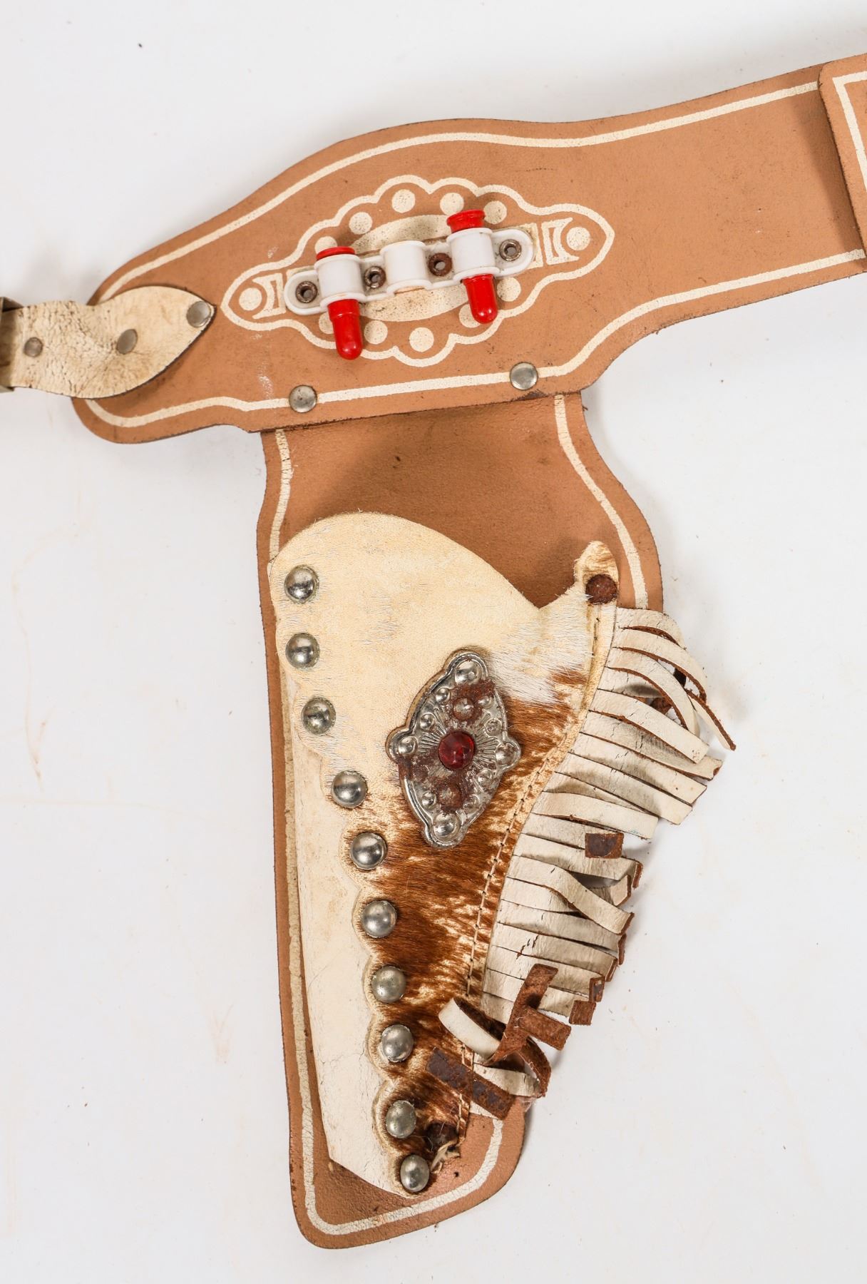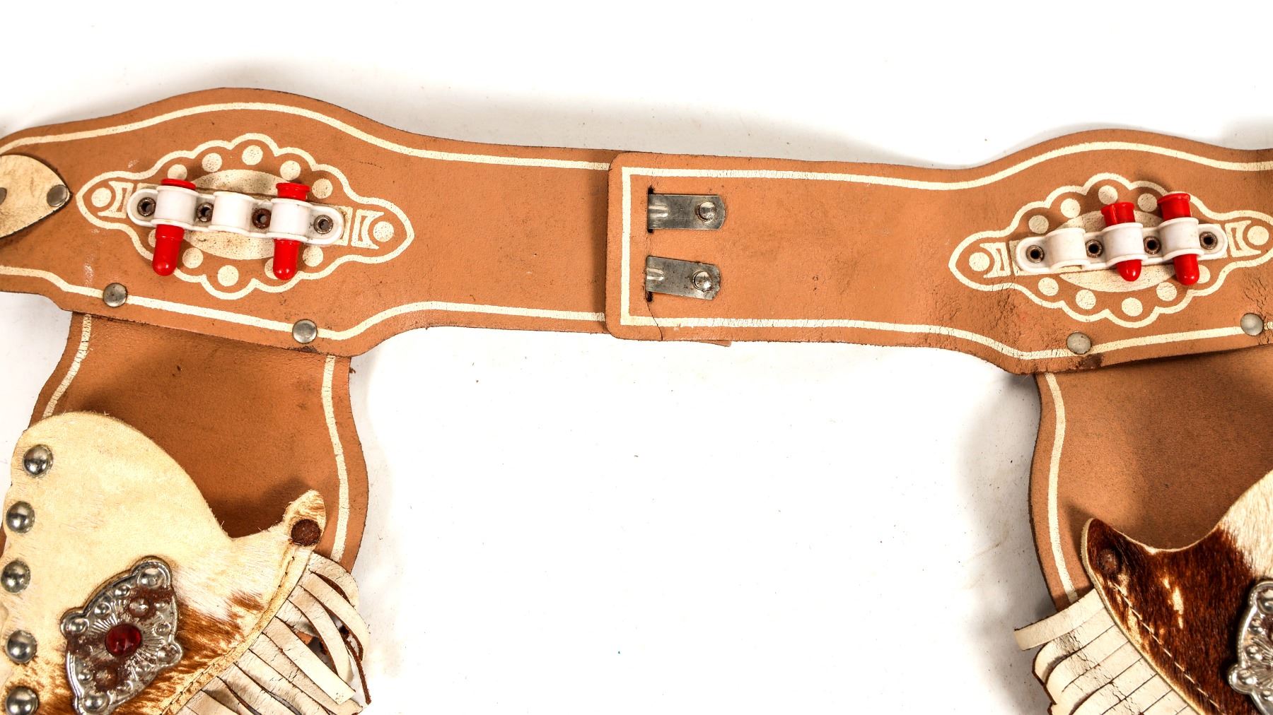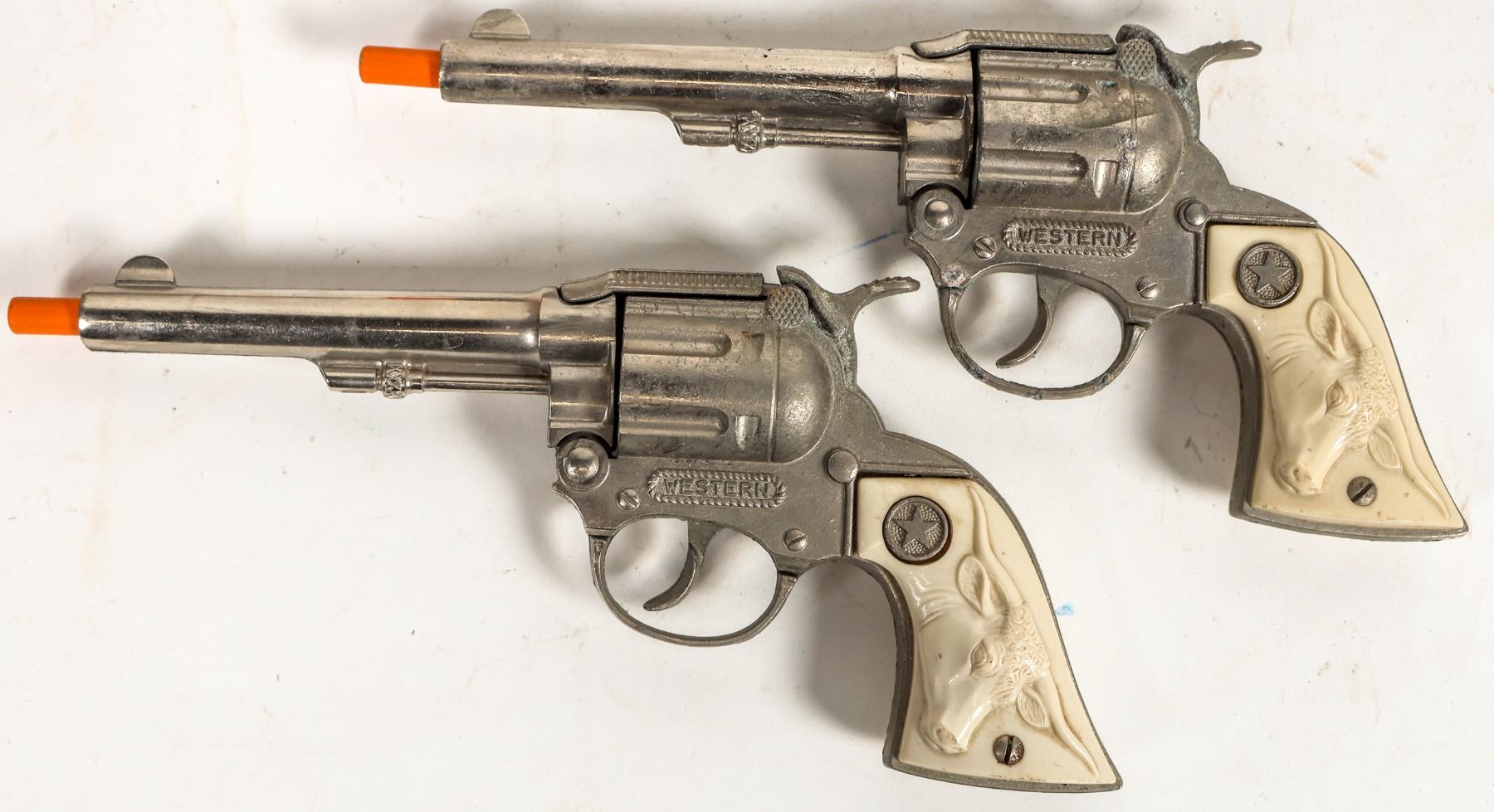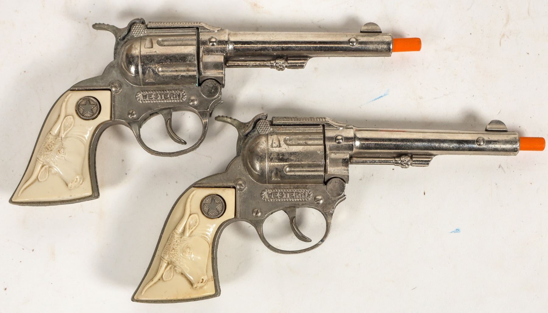 This group has two Western cap pistols with longhorn steers on the grips. The holsters are cowhide with hair-on decoration covers. Condition of guns and holsters good. Please see photos for details.