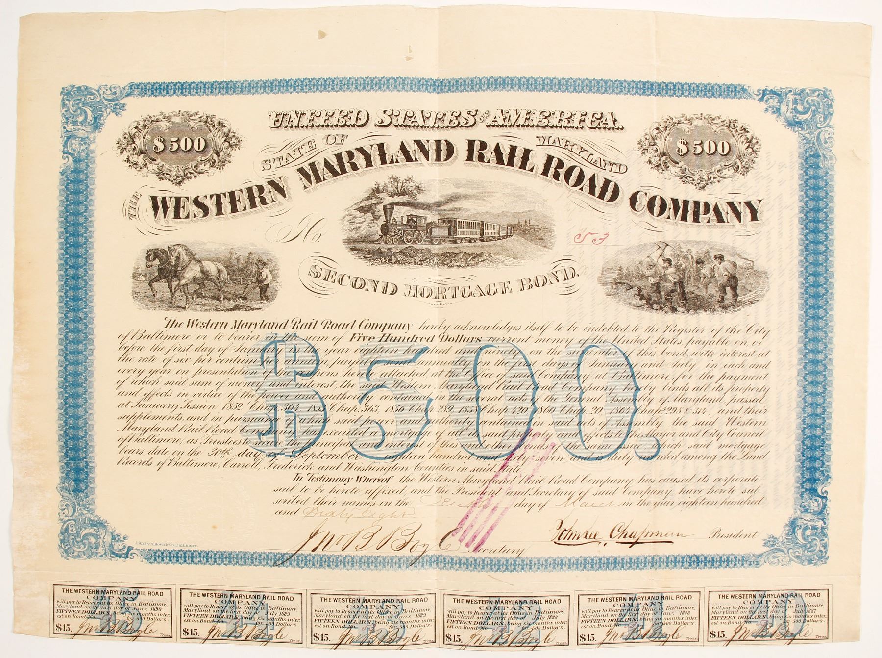 Incorp. State of Maryland 1852. Second Mortgage 6% bearer bond # 53 issued March , 1868 signed William Chapman president. "$500" blue underprint, three vignettes: farmer/ plow horse, train rounding curve, workers on railroad. Coupons attached, printer A. Hoen & co. small holes at very top (but not in printed part of certificate), no other holes, tears or stains in overall very good condition. Ken Prag Collection