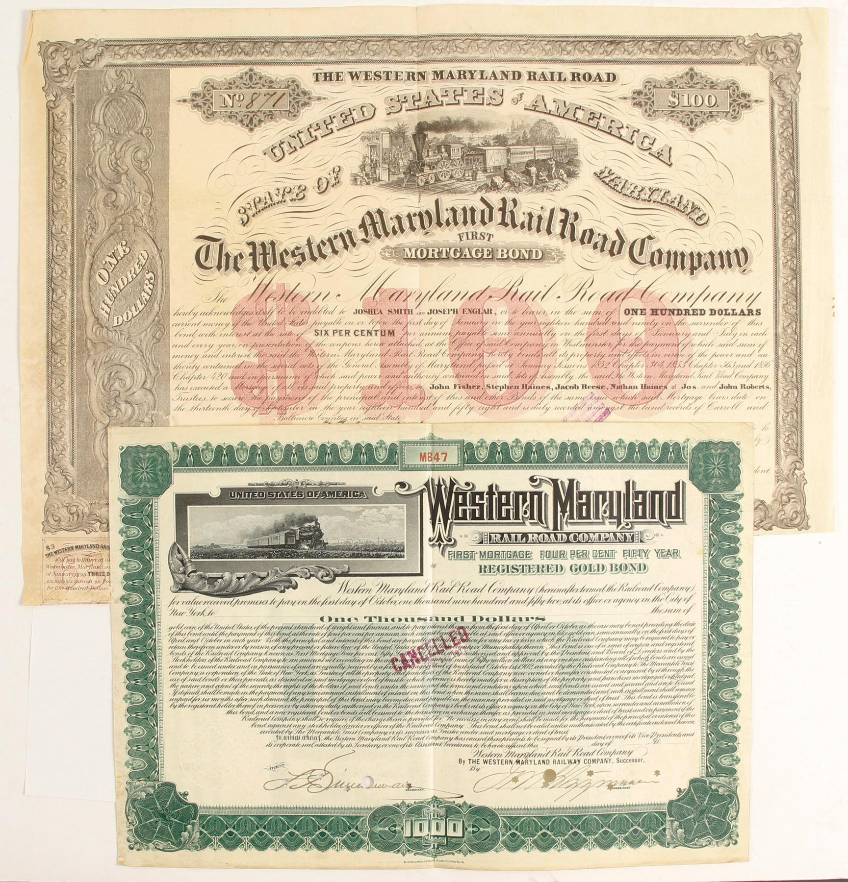 1.The Western Maryland Railroad Co. incorp 1858 State of Maryland, I/C #871 $100,6 %, First Mortgage bearer bond, issues to Joshua Smith and Joseph Englar Sept 24, 1858, signed William Roberts president, black, "$100" in red underprint, vignette top train r-l at station, small eagle on bottom, coupons attached, printer James M. Anderson & Son. VF 2.Western Maryland Railroad Co. incorp 1902 State of Maryland. U/C #M847, 4%, 50 yr, $1000 first mortgage registered gold bond, no print date, signed by president (illegible), green, vignette train passing field in box, "$1000" green underprint, printer International Bank Note Co., EF Ken Prag Collection