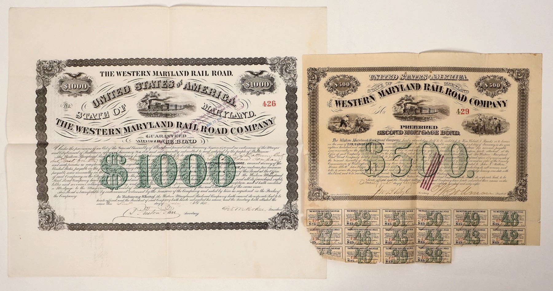 1868 $500 16 coupons-2 punch holes, small tear, verso tape repair on partial coupons and light toning and 1870 $1000 with no coupons. Please inspect.