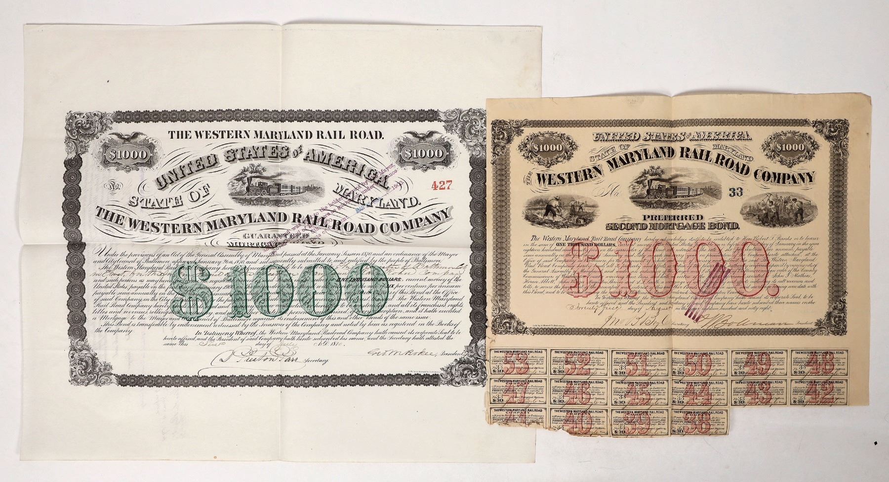 1870 w/o coupons and 1868 with 16 coupons, small hole, edge wear and small tears. Please inspect. Chartered as the Baltimore, Carroll and Frederick Rail Road Company in 1852, it became the Western Maryland Rail Road Company the next year. Largely a freight line, it extended through Western Maryland, terminating at the C & O Canal at Williamsport in 1873. Operated until 1909 when it became the Western Maryland RailRoad Co., and eventually merged into CSX in 1989