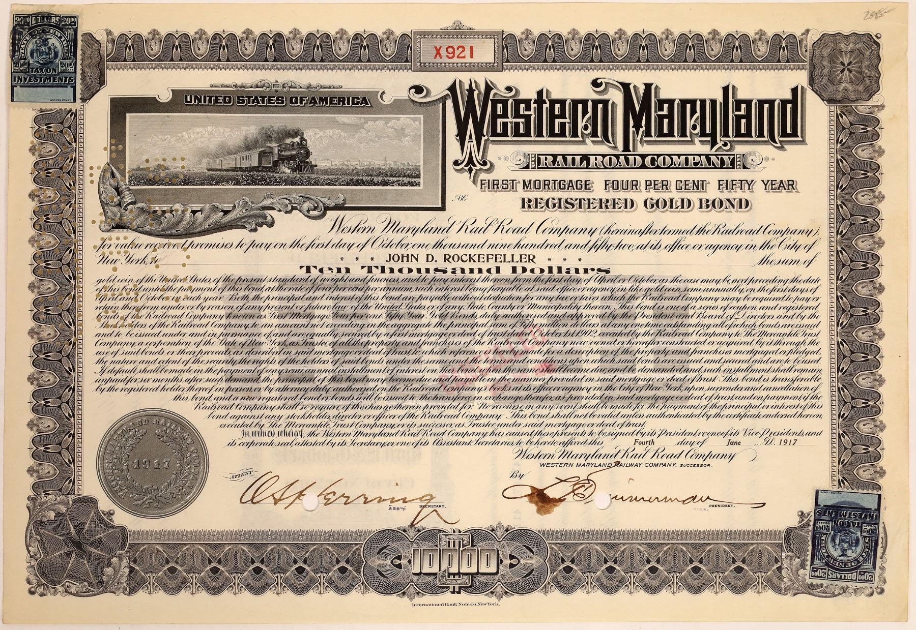 $10,000 bond no. X921, issued to John D. Rockefeller on June 4th, 1917. Not signed by Rockefeller. Signed by the vice president and asst. secretary. Punch cancelled. $20 investment revenue stamps in two corners. Gray border, railroad vignette. International Bank Note Co. 9 x 13" John D Rockefeller (1839 – 1937) was an American business magnate and philanthropist and is widely considered the wealthiest American of all time, having made his fortune through the Standard Oil Company.