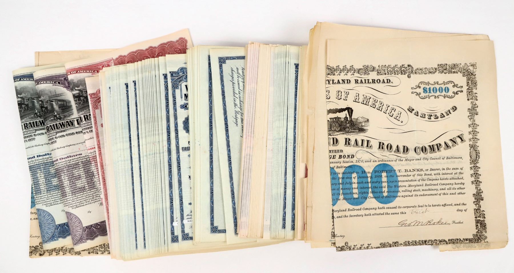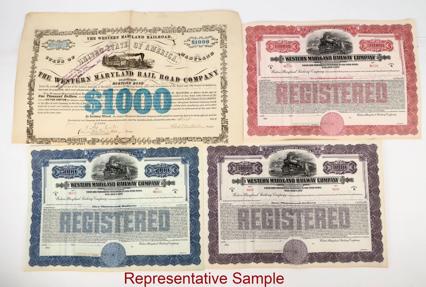 Large lot of approx. (200+) pristine Gold Bond Certificates, "First and Refunding Mortgage 5 1/2% Gold Bond." Issued by the Western Maryland Railway Company, in various denominations. The $1000 Bond in purple, the$5000 Bond in blue, and the $10000 Bond in magenta. These certificates are unissued, unsigned and not cancelled. Condition is excellent. The Due date listed on all these notes is July 1977. Wonderful Train vignette at center, with ornate borders. These measure 13.25"x9.75". Additionally, there are (4) earlier 1870 $1000 Bond certificates also in this lot, issued and executed examples. These are much larger, measuring 17.75"x10.75". Great collector group, please see photos.