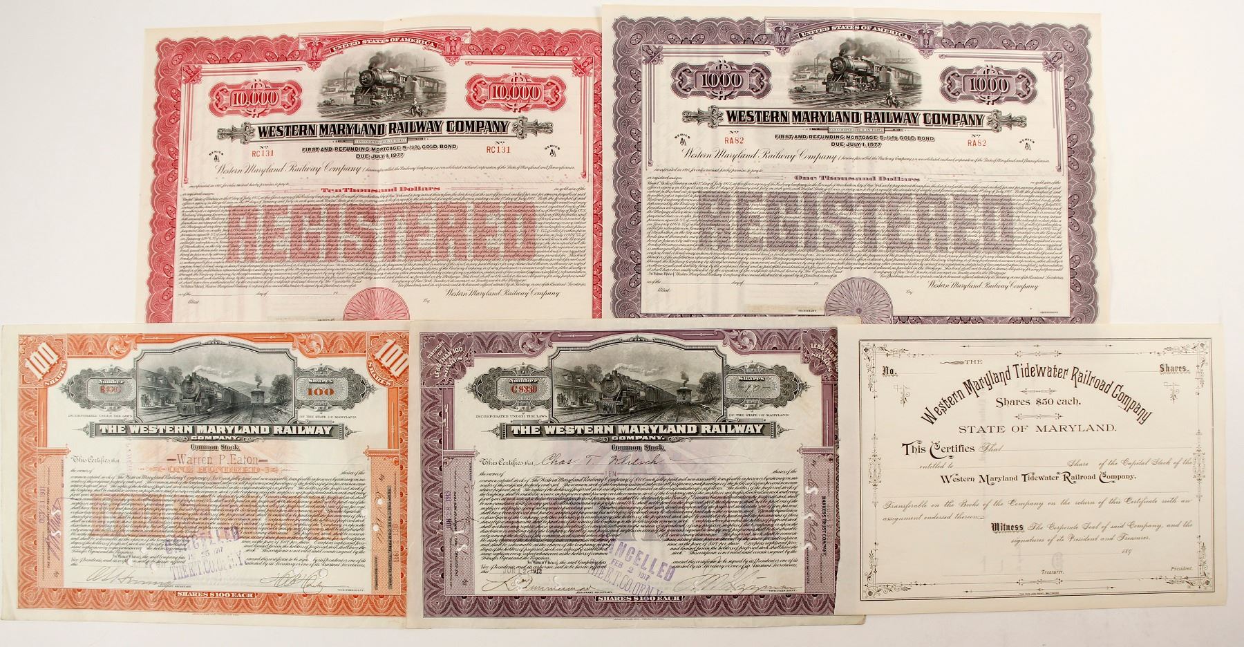 1. Western Maryland Tidewater Railroad Co.,Incorp 1883 State of Maryland. U/U $50 par, black, no vignette, printed 189_, condition AU, printer The Sun Job Print. 2. Two I/C The Western Maryland Railway Co., one orange issued 1911, one purple issued 1913, $100 par, signed, vignette train arriving and one leaving station, printer American Bank Note , condition EF 3. Two U/U Western Maryland Railway Co. One purple $1000 bond , one red $!0,000 bond, 5 1/2% due 1977, "REGISTERED" in underprint, vignette train r-l passing workers/factory in background, printer American Bank Note Co. condition EF Ken Prag Collection