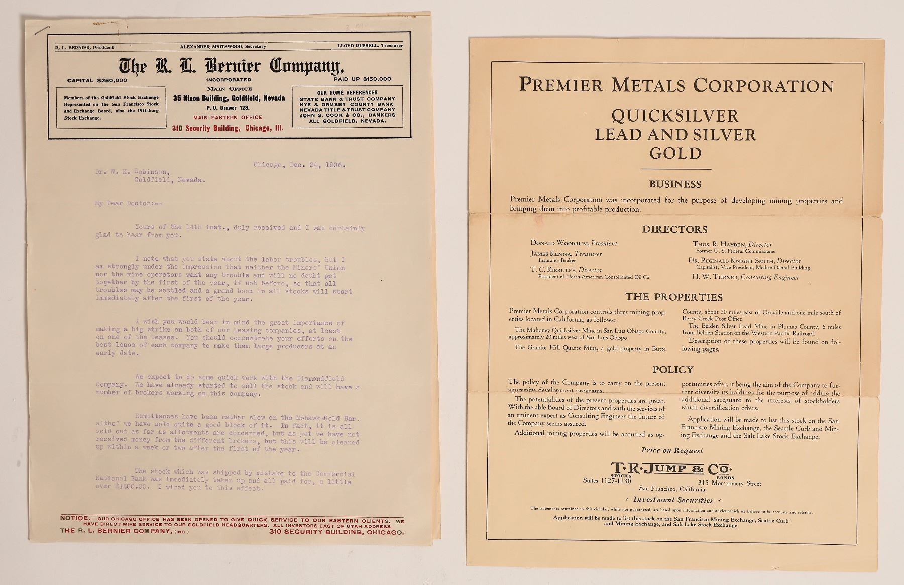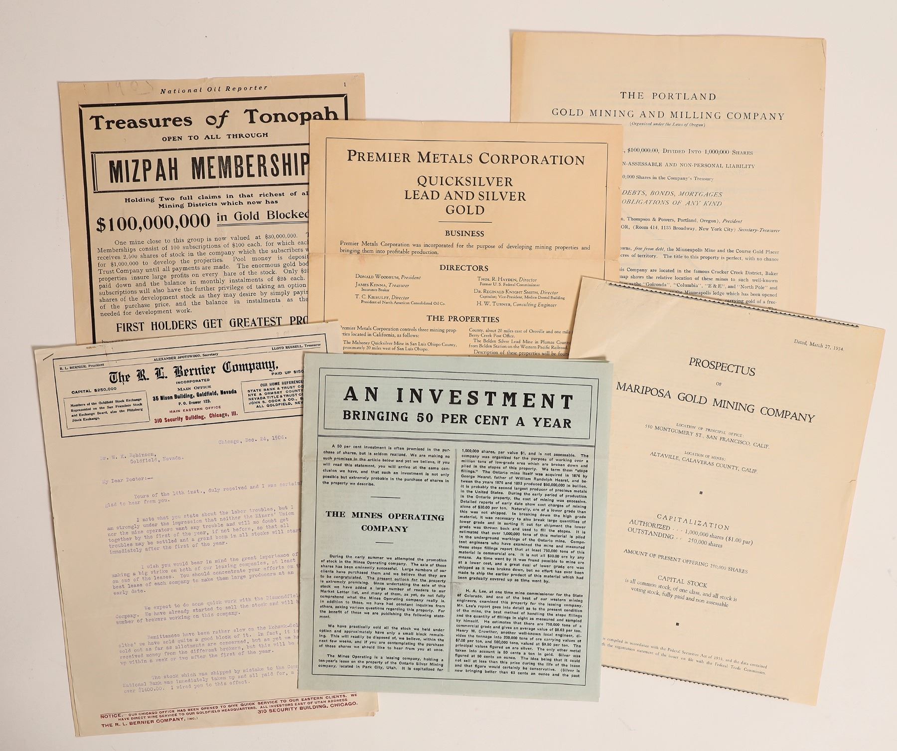Prospecti-Mines Operating Company, operates Ontario Mine in Park City, UT. 1934 Mariposa Gold MC, Portland Gold Mining and Milling-operates Minneapolis and Course Gold Placer claim, Premier Metals-controls 3 properties in California. Treasures of Tonopah Mizpah Membership application, 1906 R L Bernier 3pp correspondence. [] [] [] [] []