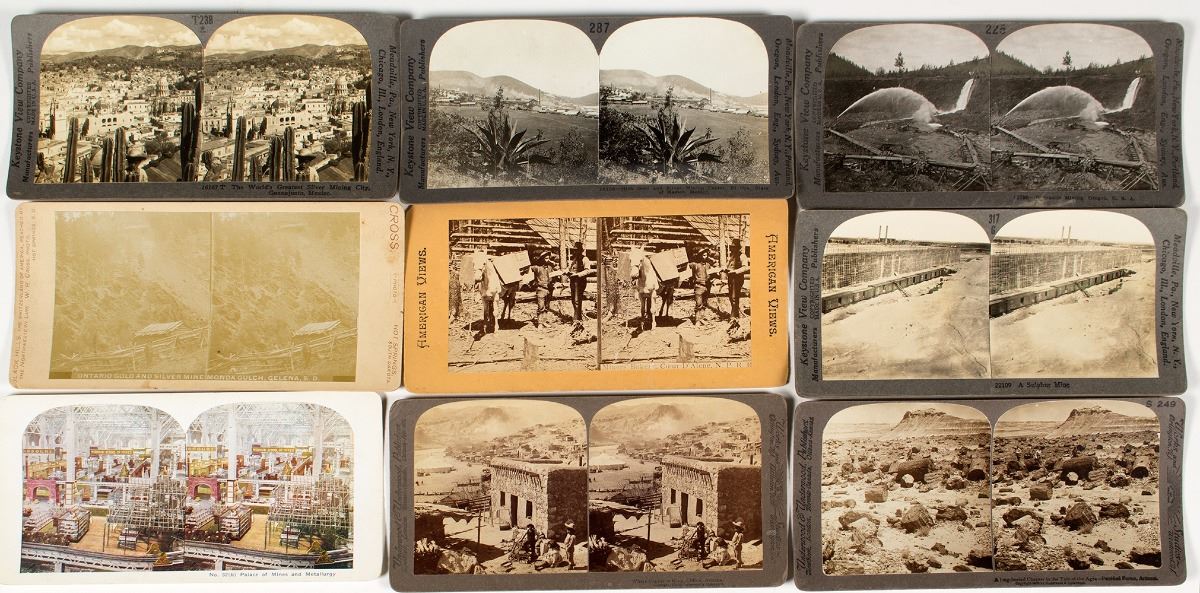 Lot of nine. Includes: Guanajuato Mexico, El Oro Mexico, sulfur mine with train, miners with a pack burro, Ontario Gold & Silver in Monda Gulch South Dakota, hydraulic mining in Oregon, petrified forest, Clifton Arizona copper. Place of Mines and Metallurgy is in color. South Dakota view is light. State: Western United States City: Date: FHWAC#: 38025
