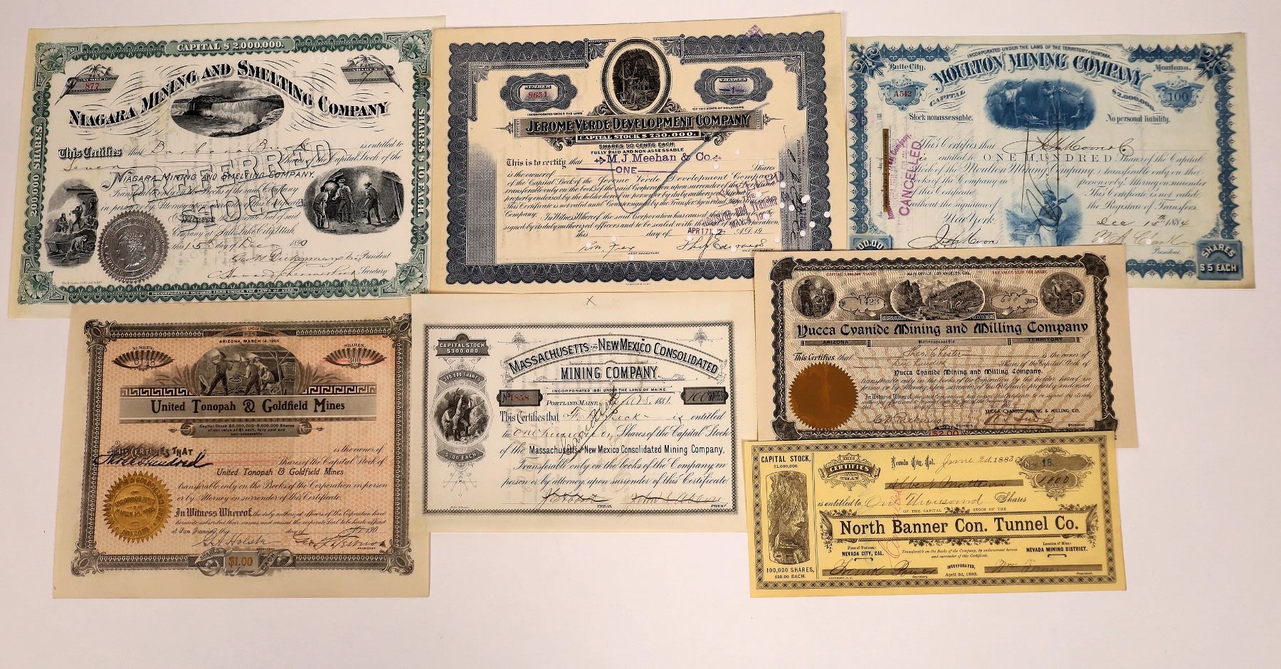 Lot of seven. Niagara Mining and Smelting, #877 issued in 1890. Has an actual silver dollar seal in silver. 2) Moultan Mining Company with financier W. A. Clark signature as president. Hole punch cancelled, but very readable. #A542 issued in 1884. 3) Massachusetts and New Mexico Consolidated. #1838 issued in 1881. 4) Yucca Cyanide Mining and Milling. Main office in Los Angeles. #1423 issued in 190-. 5) North Banner Con. Tunnel. #16 for 1000 shares. Mines located at Nevada City, California. 6) United Tonopah & Goldfield Mines. #6148. Nevada. Signed but not issued. 7) Jerome Verdi Development. #8631 issued in 1912. Arizona.