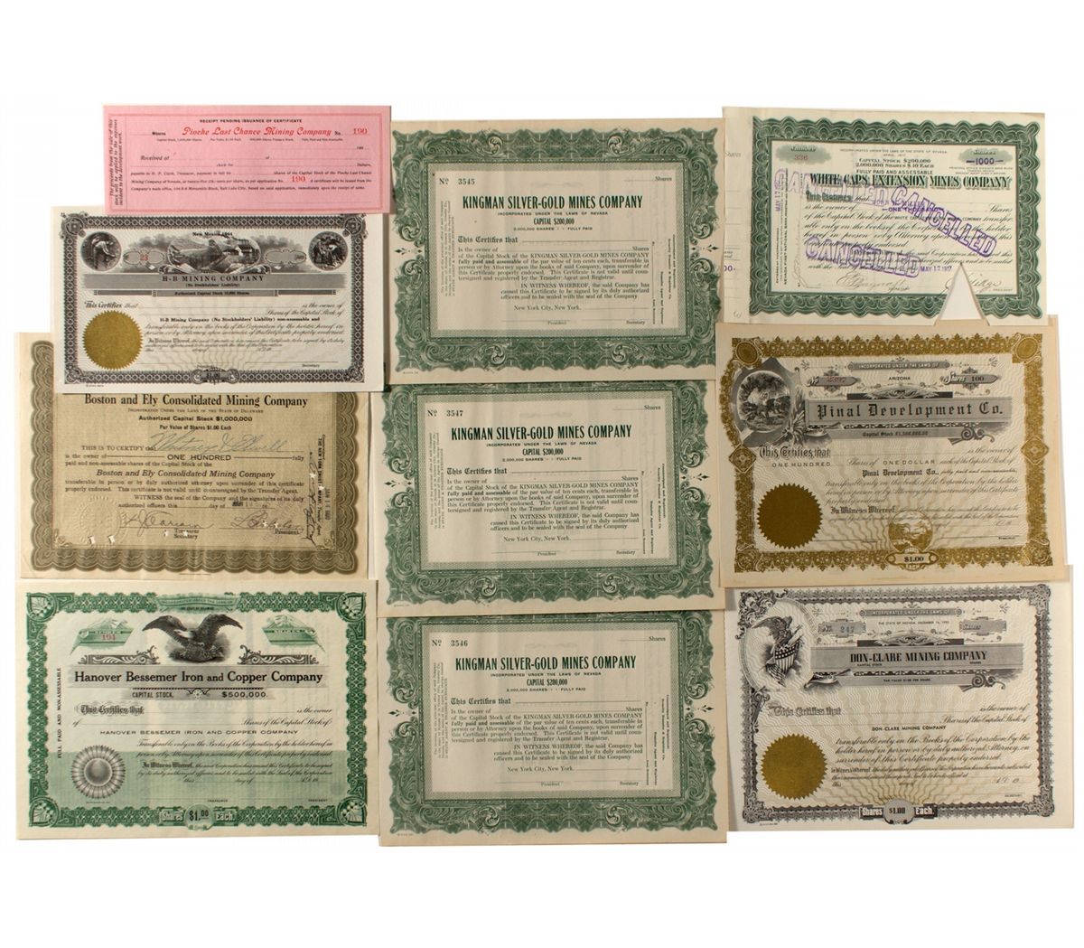Lot of 10 mining pieces, most with vignettes, from Nevada, Arizona, and New Mexico. 1) Three unissued Kingman Silver-Gold Mines Co. stocks. 2) Pinal Development Co. stock (unissued). 3) Hanover Bessemer Iron and Copper Co. stock (unissued). 4) H-B Mining Co. stock (unissued). 5) Pioche Last Chance Mining Co. certificate receipt (unissued). 6) Boston and Ely Cons. Mining Co. stock (unissued). 7) White Caps Extension Mines Co. stock (issued and cancelled) 8) Don-Clare Mining Co. stock (unissued) Date , hwac 20220