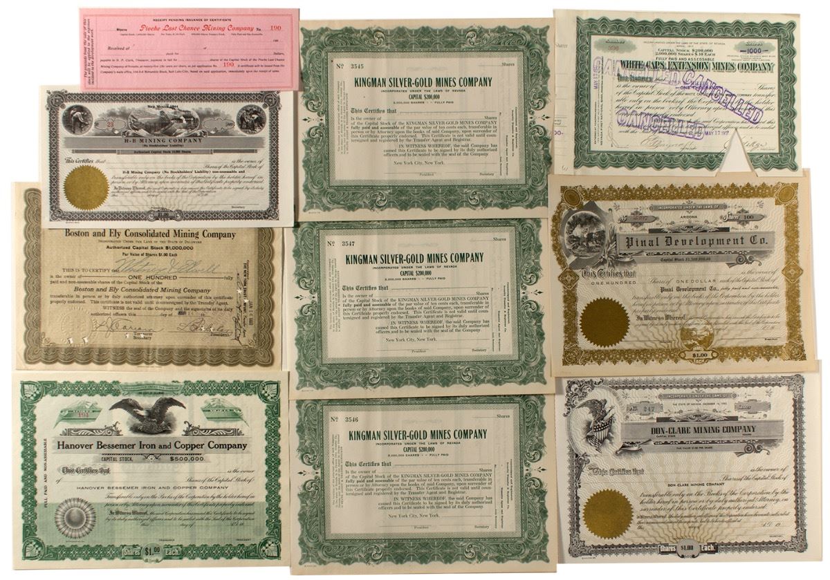 Lot of 10 mining pieces, most with vignettes, from Nevada, Arizona, and New Mexico. 1) Three unissued Kingman Silver-Gold Mines Co. stocks. 2) Pinal Development Co. stock (unissued). 3) Hanover Bessemer Iron and Copper Co. stock (unissued). 4) H-B Mining Co. stock (unissued). 5) Pioche Last Chance Mining Co. certificate receipt (unissued). 6) Boston and Ely Cons. Mining Co. stock (unissued). 7) White Caps Extension Mines Co. stock (issued and cancelled) 8) Don-Clare Mining Co. stock (unissued) City: State: United States Date: hwac# 20220