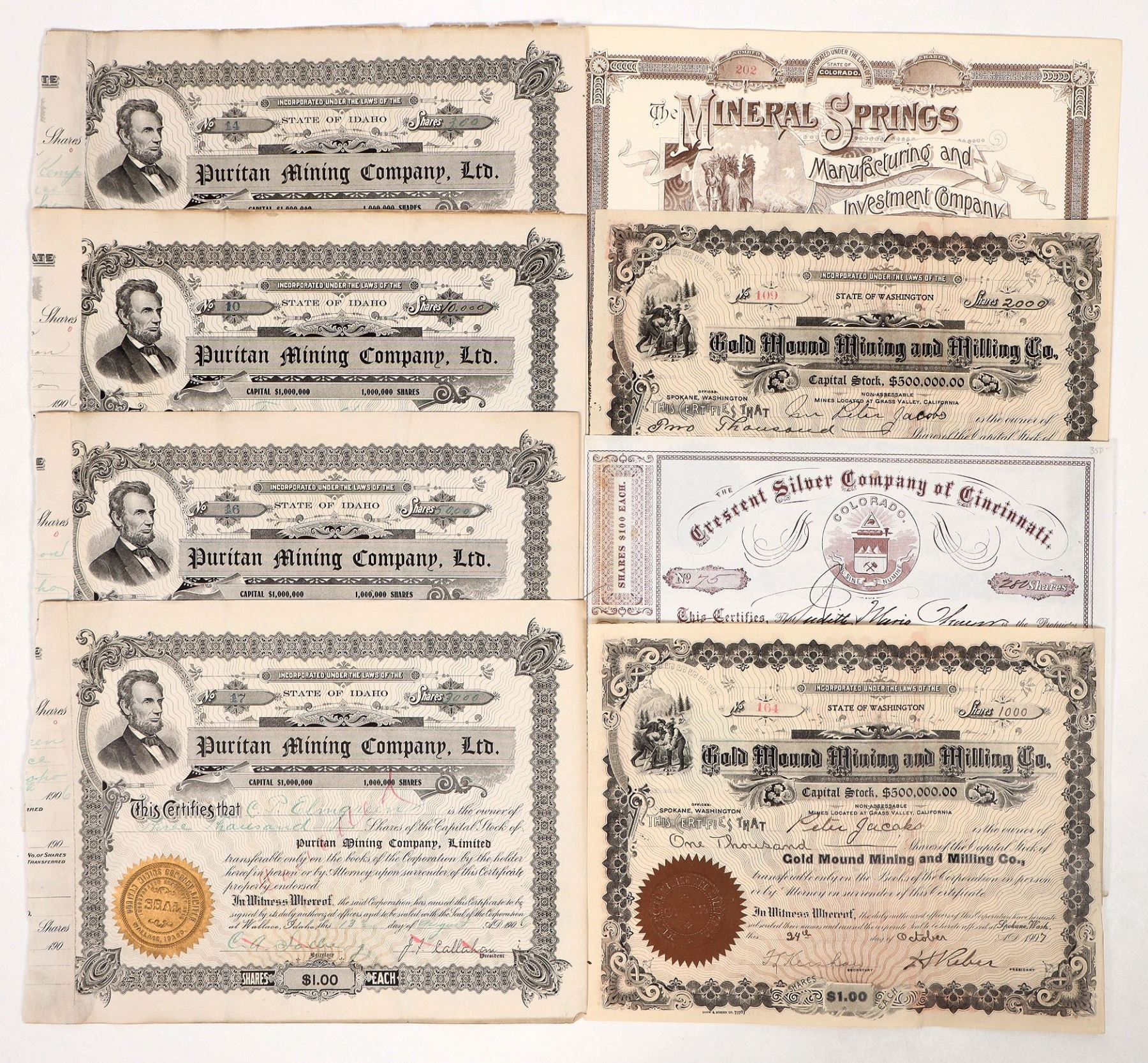 Colorado, Idaho and Washington. Issued-2x 1907 Gold Mound Mining, 1870 Crescent Silver of Cincinnati, 4x 1906Puritan Mining. Unissued- Mineral Springs Manufacturing and Investment of Denver Colorado.