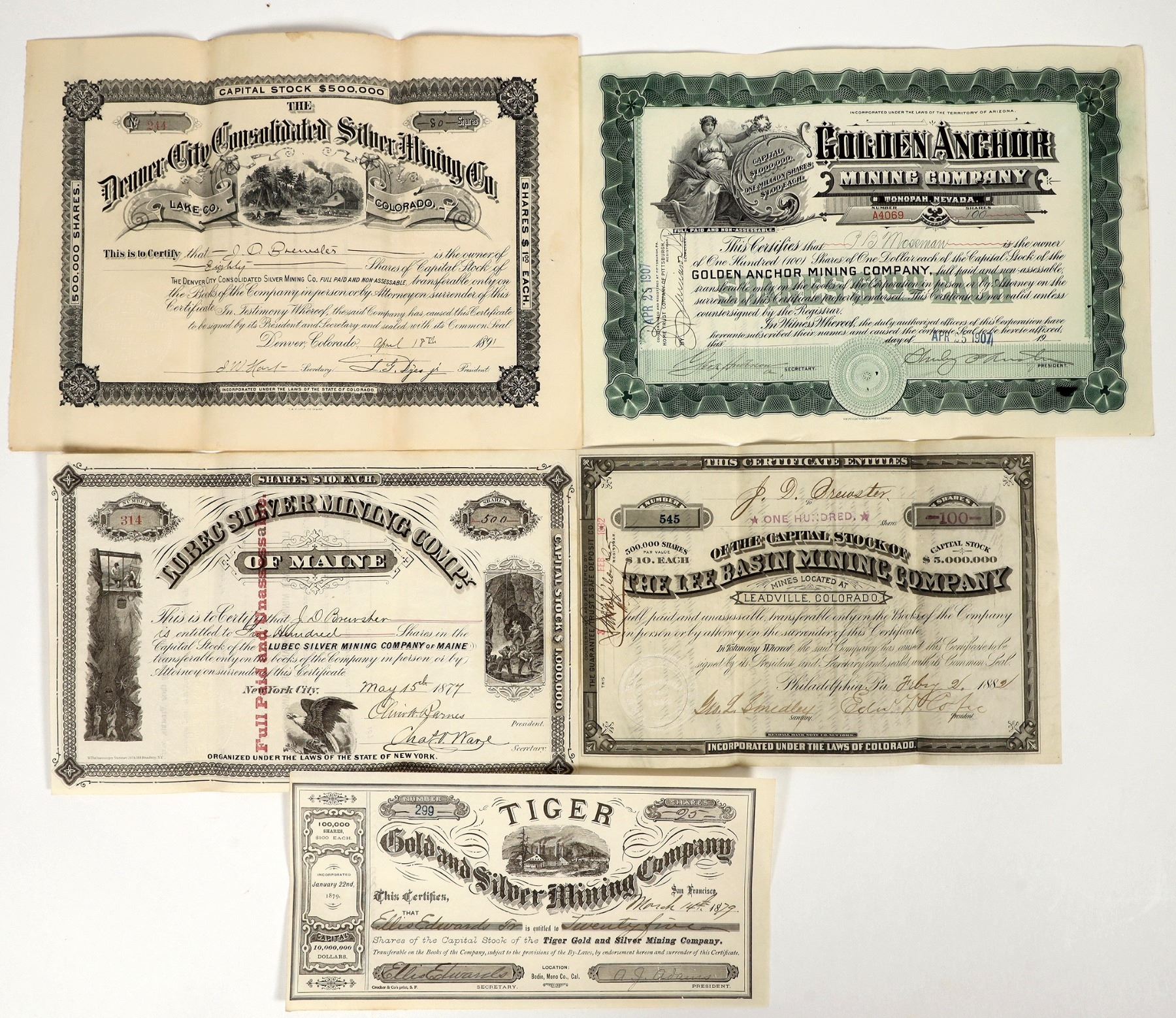 Lot of 5 different. Includes: Denver City Consolidated Silver 1891 (Lake County, Colorado), Golden Anchor Tonopah 1907, Lubec Silver 1877 Maine, Tiger GS Bodie 1879, and Lee Basin Leadville 1882. Please inspect.