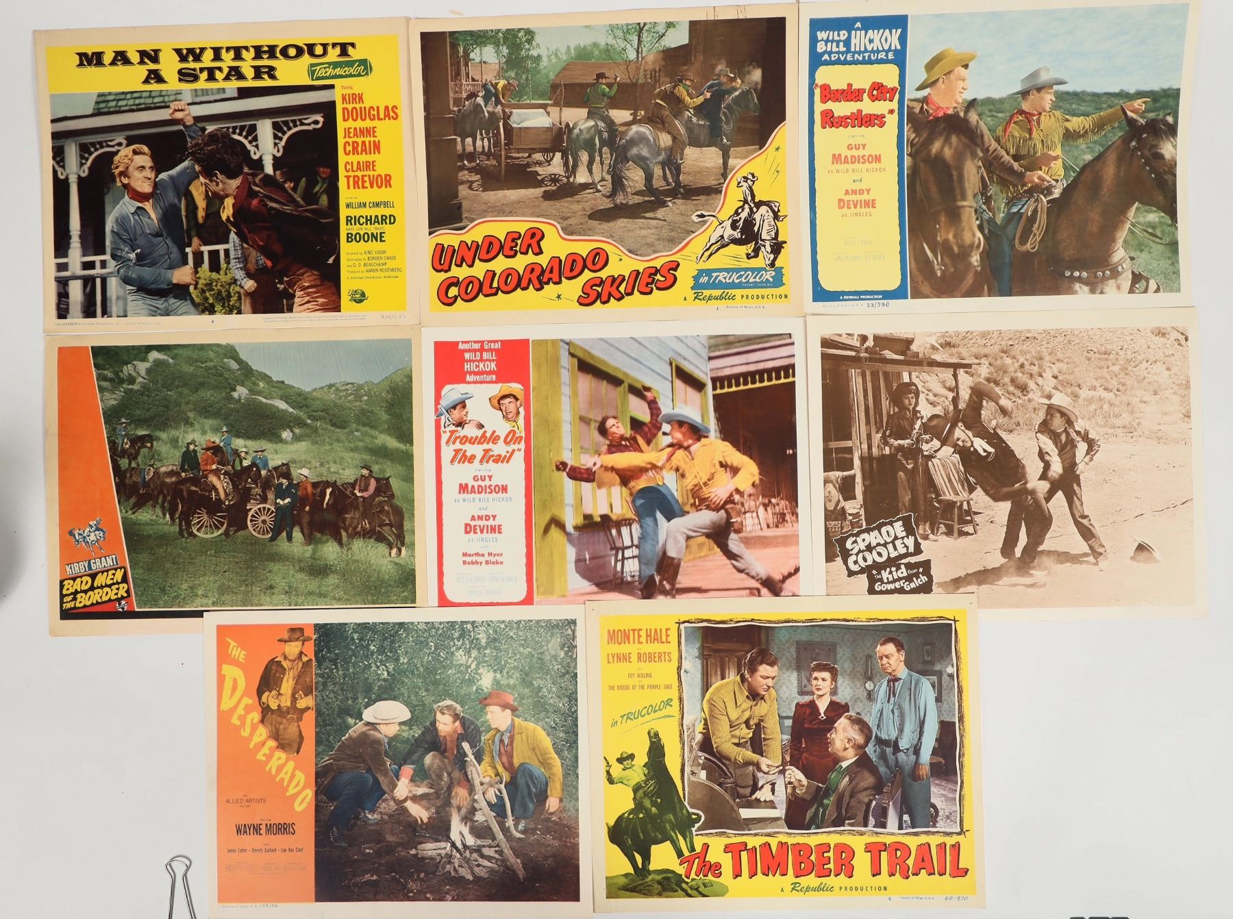Lot of 8 different lobby cards for classic Western films. Includes: Under Colorado Skies (1947), Bad Men of the Border (1945), Man Without a Star (1959), Trouble on the Trail (1954), The Kid from Gower Gulch (1950), Border City Rustlers (1953), The Timber Trail (1948), and The Desperado (1954). 11 x 14"