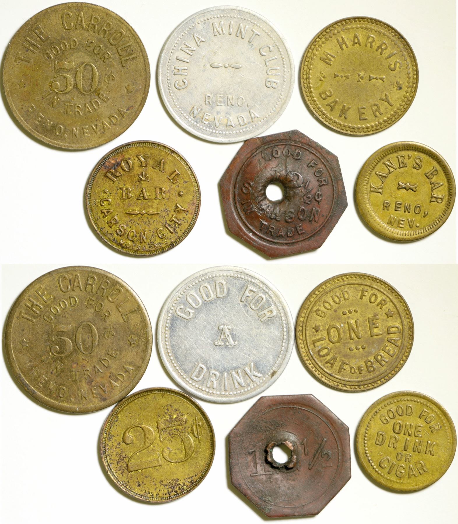 Six western Nevada Tokens. Including one from Fairview, Nevada which is now in the middle of the Fallon Naval Bombing run! 1) GF 12 1/2c / Swanson / IT // 12 1/2. Brass. Octagonal. Hole Cancelled. 2) M. Harris / Bakery / GF / One / Loaf of Bread. Maverick (Listed in token catalog as Gardnerville, Nevada). Round. Brass. 3) Royal / Bar /Carson City // 25c. Round. Brass. 4) Kane's Bar / Reno, / Nev// GF / One / Drink / or Cigar. Round Brass. 5) The Carroll / GF 50c IT / Reno, Nev. // [same as front]. Round Brass. Large size. 6) China Mint Club / Reno, / Nev. // Good For / A / Drink. Round. Circle. Large Size. City: Fairview State: Nevada Date: