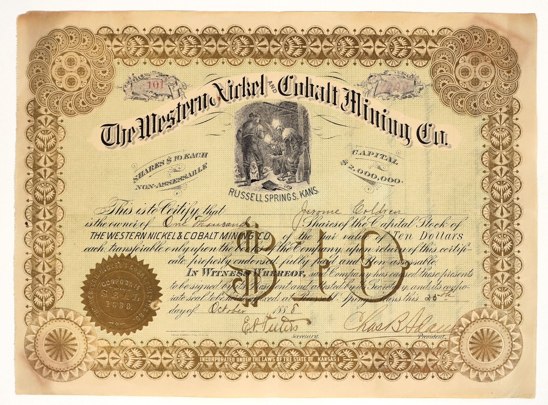 Cert. #101 issued for 1000 shares. Russell Springs, Kansas on the masthead. Large size certificate in very fine condition. This describer has never seen a Kansas mining stock issued pre-1900, so it's rare. Nice mining vignette. Cobalt mining is not currently a significant activity in Kansas. The state does not have known large-scale cobalt deposits or mining operations. In the U.S., cobalt is often produced as a byproduct of nickel and copper mining. The discovery of a vein of nickel a few miles sw of Russell Springs in the summer of 1888 generated considerable excitement. Within a few weeks, more than 60 claims had been taken in the rocky portions of the county. This began the quarrying industry of lime and sandstone which contributed to the county economy (legendsofkansas.com). VF. Uncanceled.