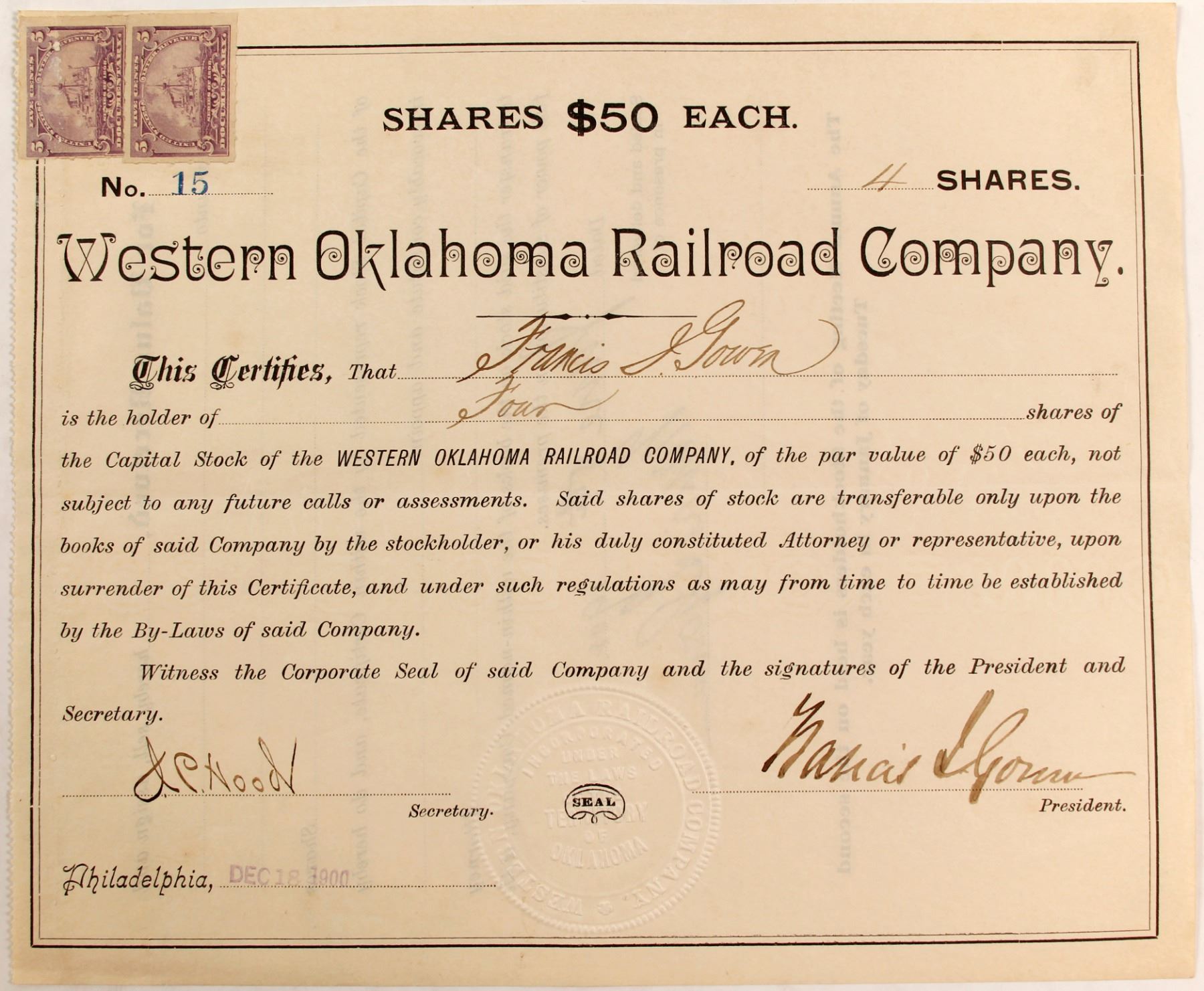 I/U #15 Francis Gowen 4 shares 19 00 signed by President Gowen. 2x 5c doc stamps. Prag Collection.
