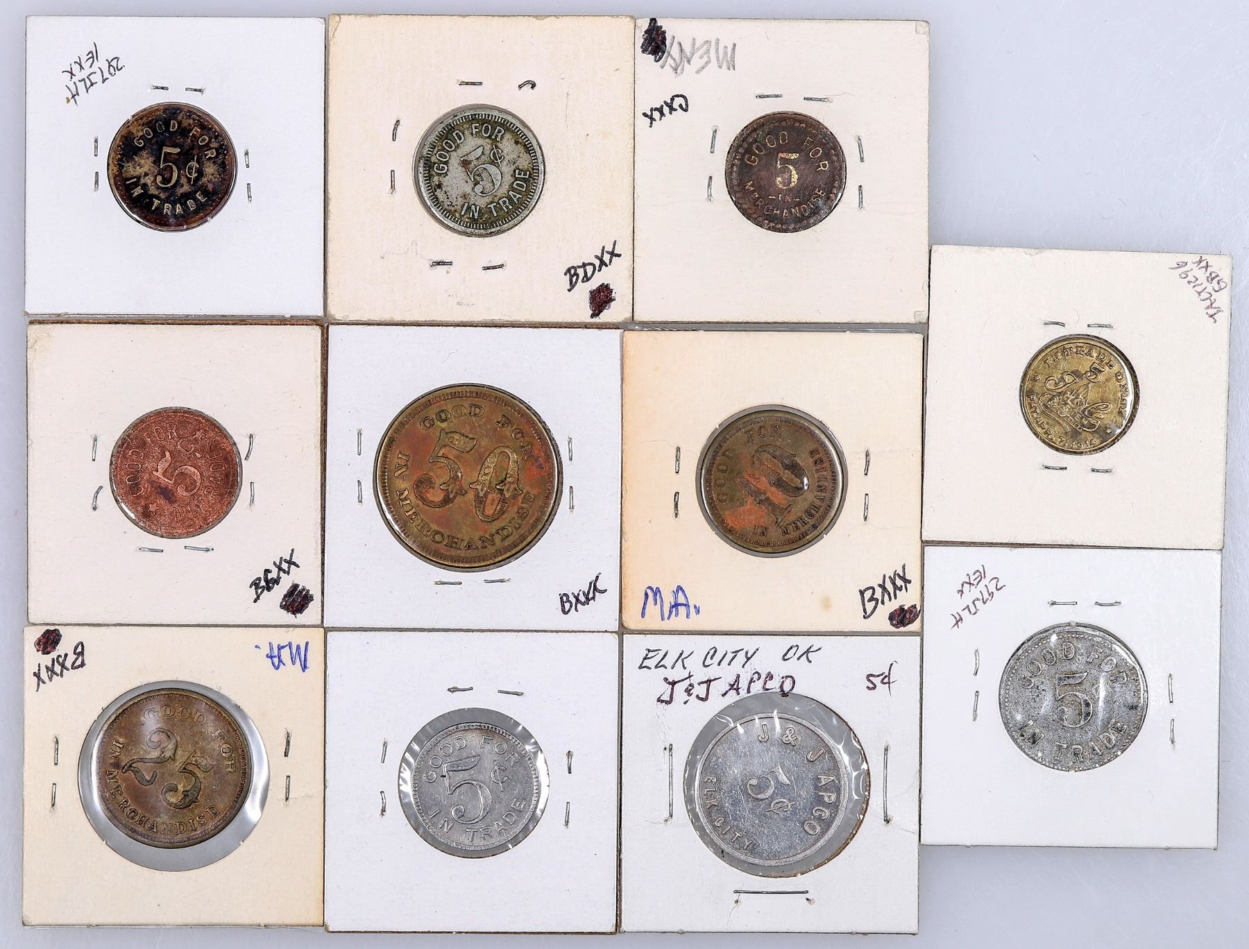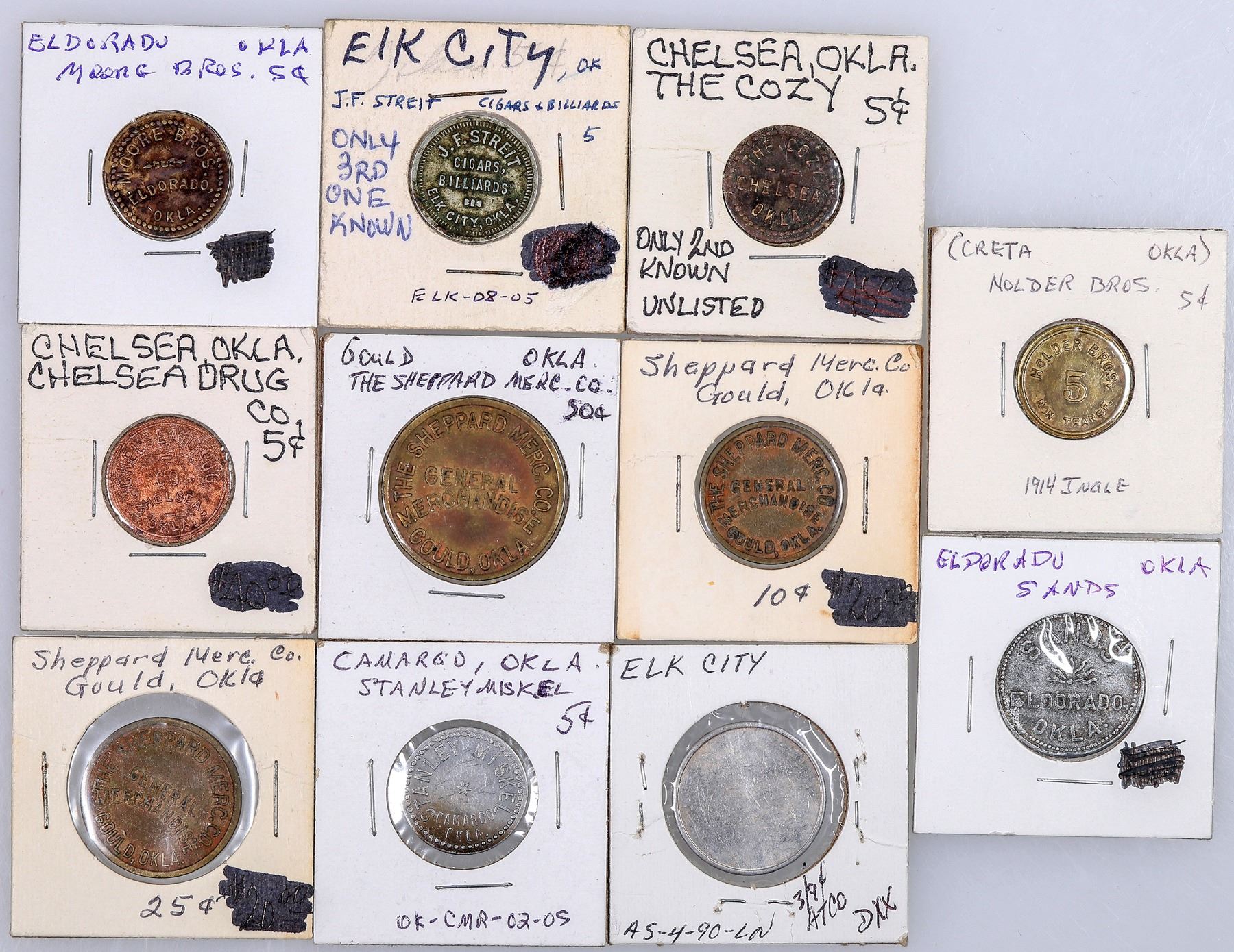Lot of eleven tokens from western Oklahoma towns. Camargo: Stanley Miskel; Chelsea: Chelsea Drug Co., The Cozy; Creta: Holder Bros.; El Dorado: Moore Bros., Sands; Elk City: J & J Apco, J. F. Streit Cigars; Gould: Sheppard Merc. Co. (3 different denominations.)