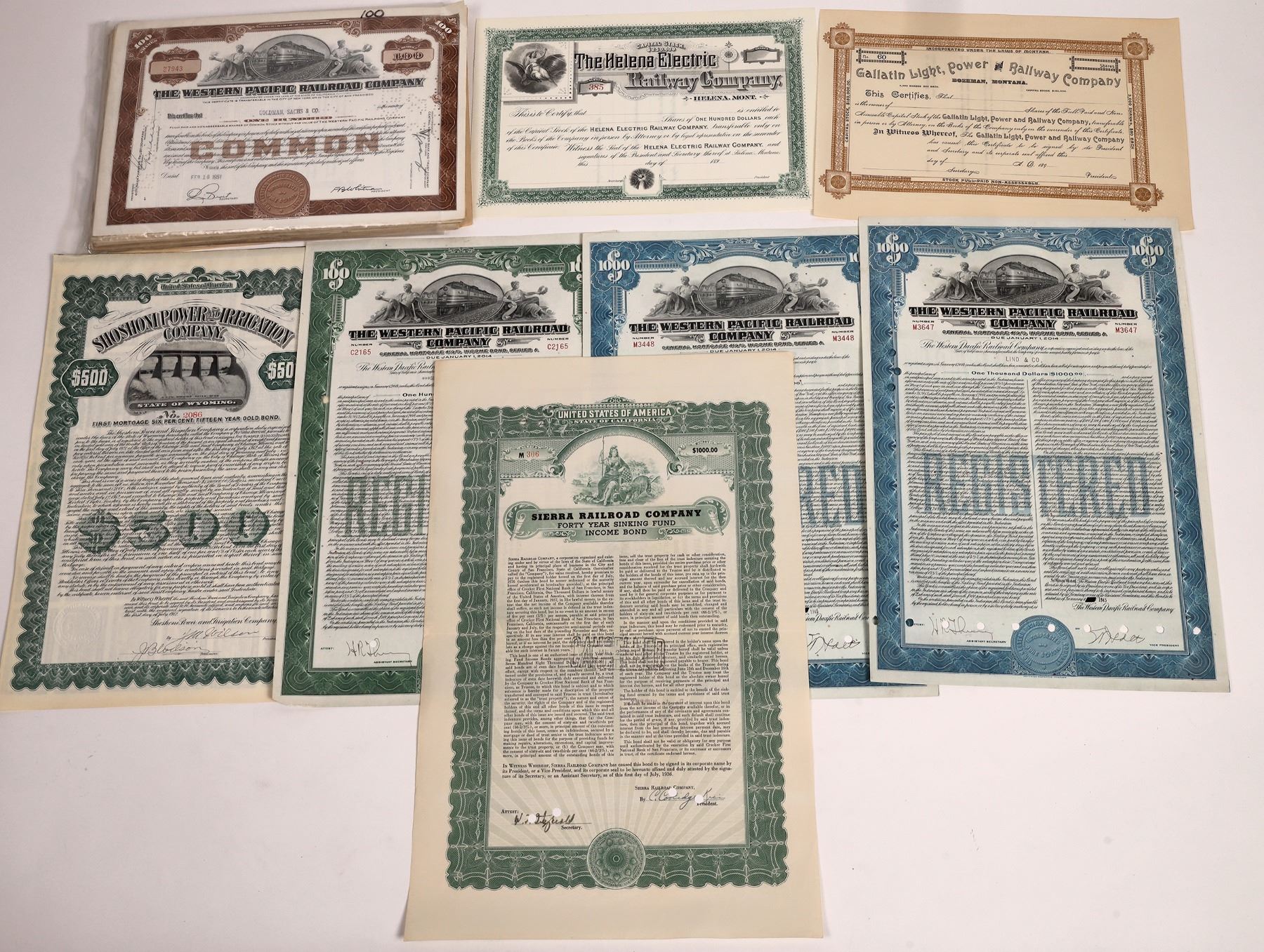 Lot of 108 railroad stocks and bonds including 100 Western Pacific RR common share stock certificates issued 1951 - 1953 and signed by F B Whitman/President, all cancelled. Collection also includes 2 WPRR $1000 bonds issued 1945, 1 WPRR $100 bond w/issued date blacked out, 1 Helena (MT) Electric RW Co stock cert unissued but dated 189_, 2 Gallatin (Bozeman, MT) Light, Power & RW Co unissued stock certs dated 189_, 1 Shoshoni (WY) Power & Irrigation Co $500 bond w/coupons attached issued 1912, and 1 Sierra Railroad Co $1000 bond issued 1936. All issued items cancelled. Condition: no tears, all in excellent condition. Note: Western Pacific Railroad Company was formed in 1903 as an attempt to break the near-monopoly the Southern Pacific Railroad had on rail service into northern California. WP's Feather River Route (through Portola, CA) directly competed with SP's portion of the Overland Route for rail traffic between Salt Lake City/Ogden, Utah, and Oakland, California, for nearly 80 years. The Western Pacific was one of the original operators of the California Zephyr passenger line. In 1982, the Western Pacific was acquired by the Union Pacific Corporation and it was soon merged into their Union Pacific Railroad (from Wikipedia). State: City: Date: Provenance: Stuart Mackenzie Montana Ephemera Collection