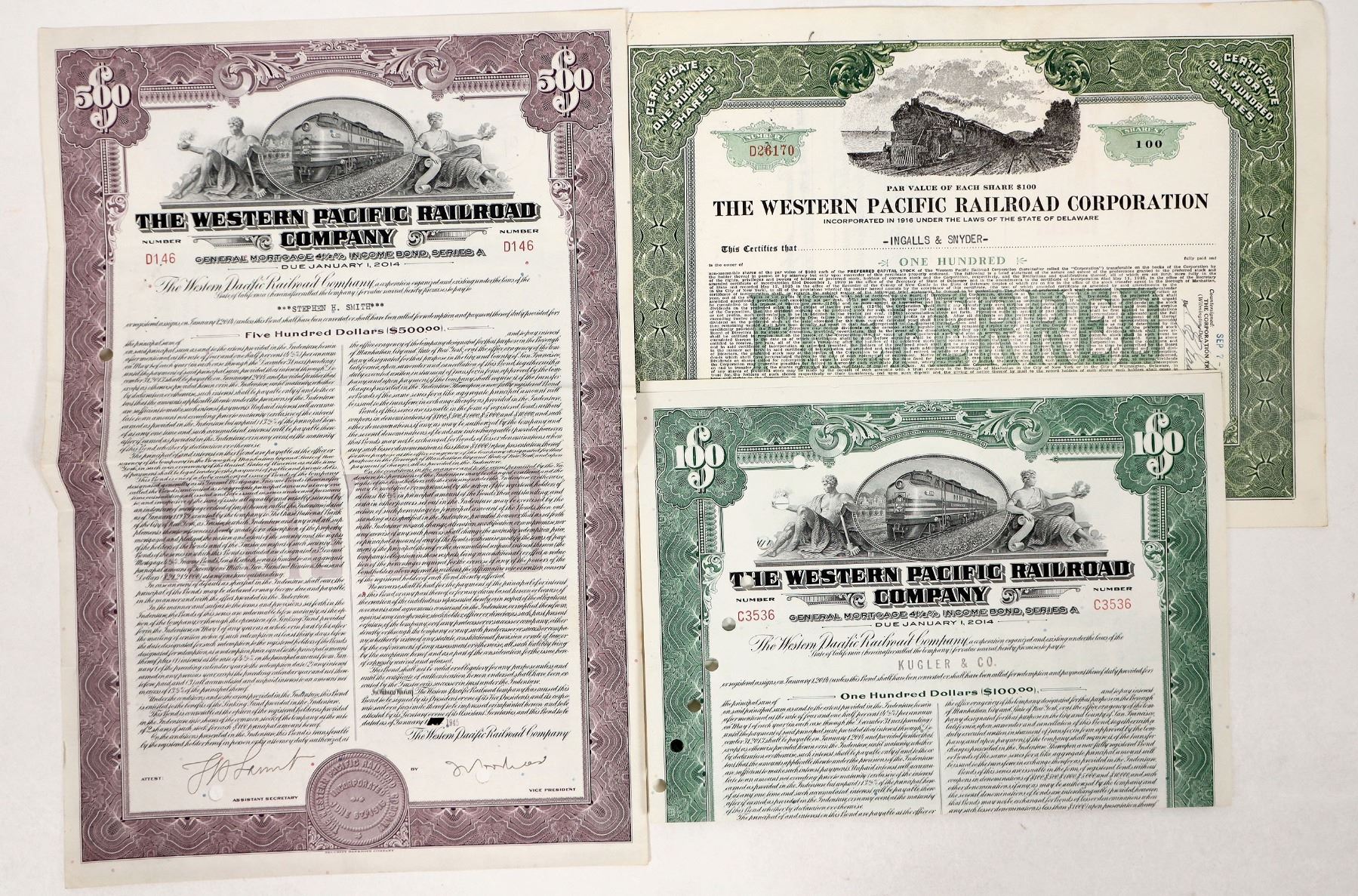 A group of 2 bond certificates and 1 stock certificate from the Western Pacific Railroad Company, dating 1939-1948. Both bond certificates are cancelled using hole-punch cancellations. All three have beautiful vignettes of locomotives. All in good condition; some creasing from storage.