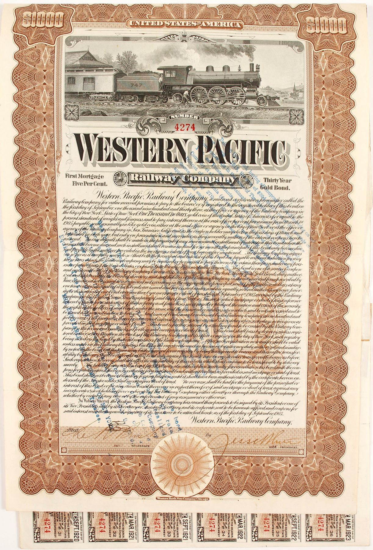 Rare. Brown #115 $1000 first mortgage 5% 30 year bond. Most coupons intact. Locomotive and tender vignette. 3 blue stamps on front. Prag Collection.