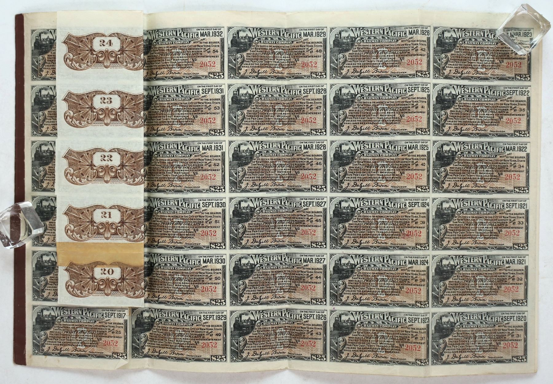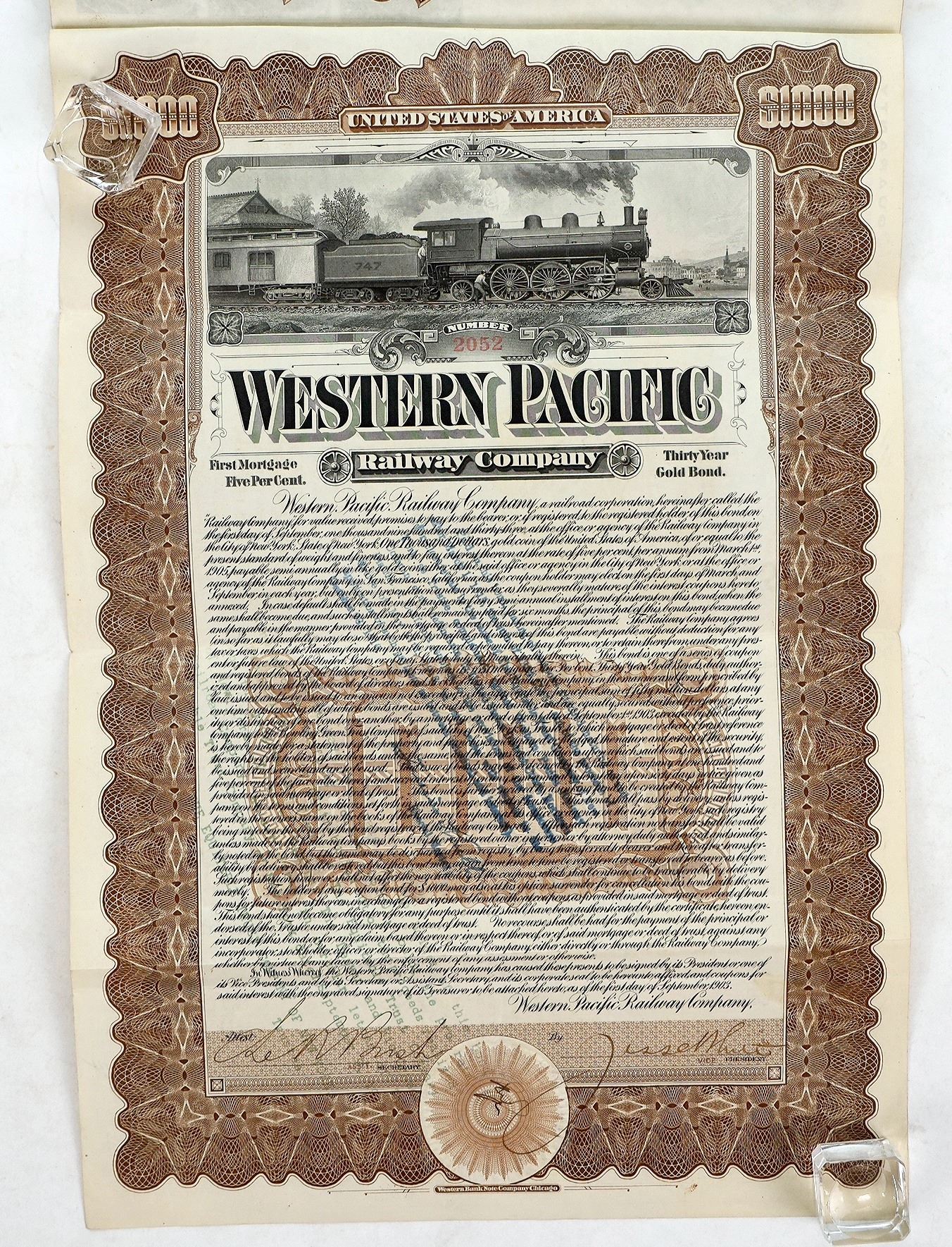 Rare. $1,000 uncancelled bond issued in 1903. Signed by the vice president and assistant secretary. Brown border with great locomotive vignette. Western Bank Note Co., Chicago. One full sheet of coupons, plus partial. 14 x 9.5" The Western Pacific Railway was incorporated in 1903 to compete with Southern Pacific. Under the direction of George Jay Gould I, they proposed to build a standard gauge track connection to the Pacific Coast for his aspiring Gould transcontinental system. Construction was financed by the Denver and Rio Grande Western Railroad.