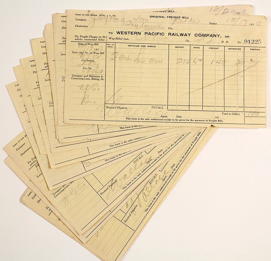 Lot of 13 freight bills for the Keddie Station of the Western Pacific Railway Company, 1910. All are receipts for packages consigned by JC Young of Taylorsville. One receipt is for a package transported from Boca on the Boca & Loyalton Railroad. Keddie is located in Plumas County, California. HWAC# 60051 Date: 1910 Location: Keddie, California