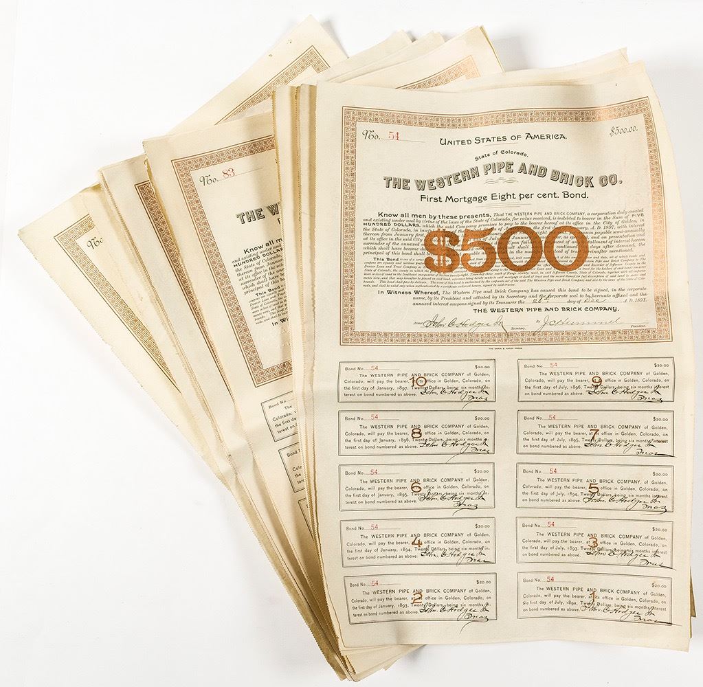 Total of twelve bonds. Earliest is number 53. All twelve are intact with all 10 coupons. Signed by John Hodges Jr and JC Hummel. Horizontal fold. Pages are curled at right. No sign of staining or water damage. Date: 1891 Location: Golden, Colorado HWAC # 40571